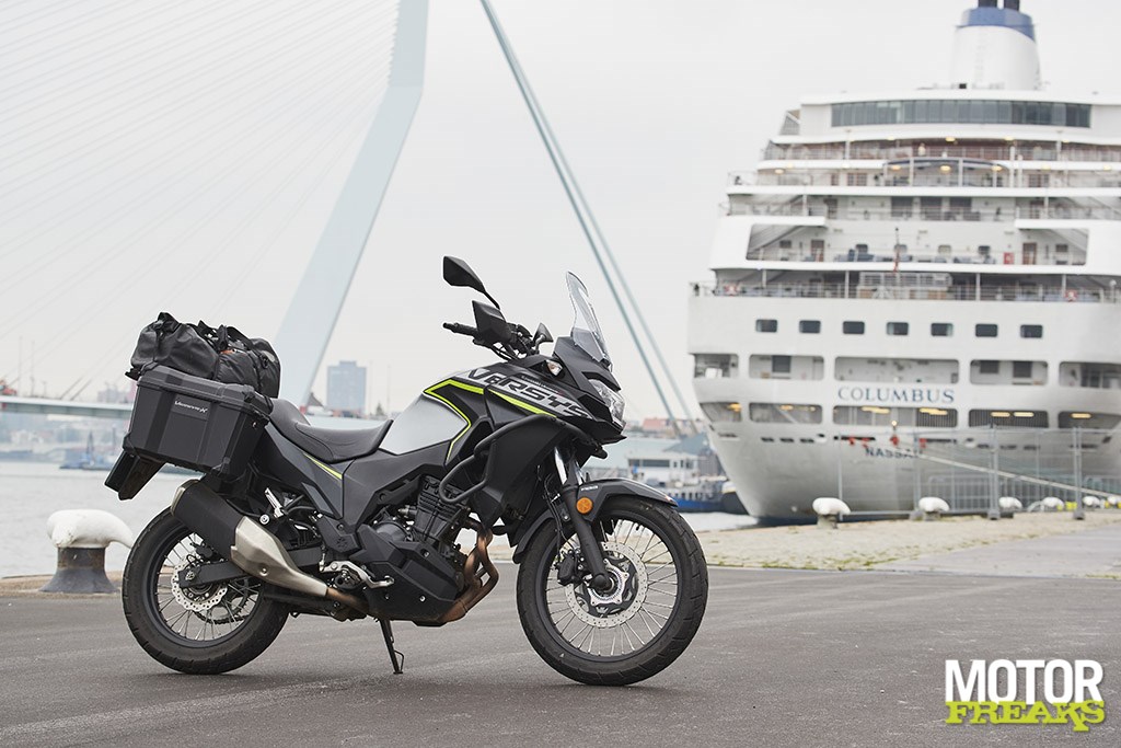Dat spullen op de motor pakken gaat trouwens supergemakkelijk. Standaard is de Versys-X 300 al voorzien van stevige handgrepen en een bagagerek met ogen om een sjorband (of in ons geval: een Rockstrap) doorheen te halen, daarnaast was ons testexemplaar voorzien van het Adventure pakket dat naast valbeugels, handkappen, een middenbok en een tankpad uit twee 17 liter kunststof zijkoffers bestaat. Niet echt supergroot (en daardoor totaal niet hinderlijk bij bijvoorbeeld filerijden), maar gelukkig wel precies groot genoeg voor m’n laptopschoudertas, waar alle elektronische apparatuur en laadstekkers en kabels in zit. De andere koffer gebruik ik om wat grijpgrage spullen in op te Laat ze maar, wij weten wel beter ondertussenbergen als een fotocamera om onderweg kiekjes te kunnen maken, een regenbroek (je weet maar nooit) en wat flesjes water voor onderweg, en de rest van de spullen in m’n bagagerol. Meer dan genoeg bagagemogelijkheden dus om er een weekje tussenuit te gaan.