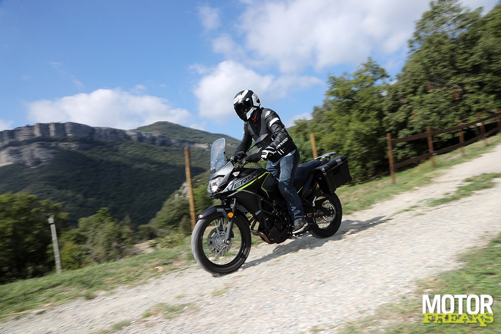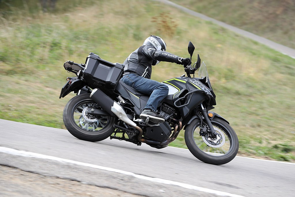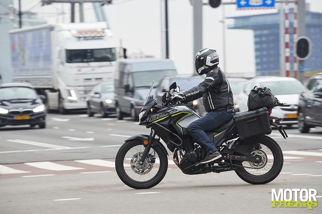 Dat superwendbaar heeft de Versys-X ook te danken aan z’n uitgekiende zit. Oorspronkelijk hadden ze in Akashi een 815 mm zadel bedacht, dat optioneel voor een 845 mm zadel kon worden ingeruild, maar in Europa hebben ze dat slim omgedraaid en het 845 mm zadel standaard gemaakt, waardoor ‘ie veel volwassener aanvoelt dan de typenaam doet vermoeden en ergonomisch nu heel erg doordacht is. Ondanks dat ik met 1.72 mtr lengte niet al te groot ben krijg ik gemakkelijk beide voeten aan de grond, alleen het opstappen is vanwege de koffers wat lastiger, maar 9 van de 10 keer stap ik gewoon via de voetsteunen op.