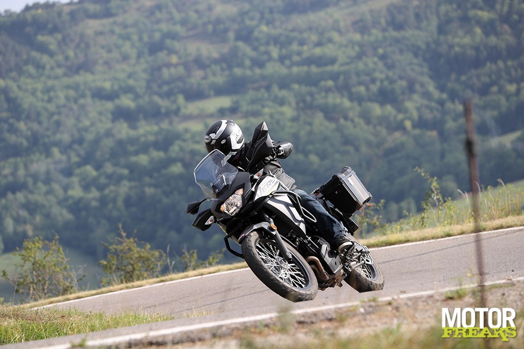 Omstandigheden waarvan je denkt “Oh was ik maar…”, maar opnieuw raakt de Versys-X 300 hiervan niet van de wijs. Sterker: ondanks het slechte weer heb ik het echt prima naar m’n zin en had voor nu misschien alleen handvatverwarming gewenst, maar dat is ook het enige. Het tempo is niet veel langzamer dan dat het de eerste twee zonovergoten dagen was en in alle eerlijkheid zijn er niet veel motoren waar ik onder dit soort omstandigheden zoveel plezier mee heb gehad en zo sportief en gemakkelijk heb gestuurd. Wat naast de goede vering door de zijdezachte gasrespons, de lineaire vermogensafgifte en zeer gebruiksvriendelijke remmen komt. Trouwens, wat remmen betreft: de enkele schijf voor had van mij iets meer bite mogen hebben, maar buiten dat is er geen reden tot klagen: de vertraging is prima voor elkaar.