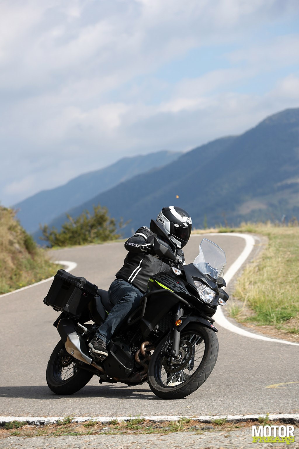 Eenmaal de verkeersinfarct van Lloret achter me tokkel ik relaxt met het verkeer mee, waarbij de toerenteller zo rond de 6~7.000 toeren verblijft. Als je alle ruimte hebt is inhalen vervolgens prima te doen, maar wie dat even vlug wil doen zal twee of drie versnellingen terug moeten gaan. Waarbij we bij het tweede punt aan zijn gekomen waarin deze X ontzettend uitblinkt: de versnellingsbak. Mooi dat Kawasaki een slipper-assist koppeling heeft voorzien die de bediening vederlicht heeft gemaakt, maar behalve met wegrijden heb je de koppeling nergens voor nodig. Zowel opschakelen als terugschakelen gaat ook zonder koppeling perfect, who needs a quickshifter wanneer je een bak hebt die zo goed schakelt als deze Versys-X 300. "Elke weg, elk moment." Dat moesten we dan maar eens proberen hè...Als op het kleine stukje vierbaansweg het tempo wordt bespeur ik lichte trillingen in de voetsteunen, maar dat komt meer door z’n maagdelijke kilometerstand van net 400 kilometer. Tweeduizend kilometer later terug in Nederland zijn ze weg (of we zijn er gewend aan geraakt en dat het ons niet meer stoort, dat kan natuurlijk ook). Bij 120 km/u in zes draait de 289cc paralleltwin 9.000 tpm en met het rode gebied vanaf 12.000 tpm lijkt het einde dan wel in zicht te zijn, maar de begrenzer grijpt pas 1.000 toeren later bij 13.000 tpm in. Niet dat we dat in zes hebben gered, maar inmiddels alweer een weekje terug in eigen land weten we dat een kruissnelheid van 140 km/u prima is te doen.