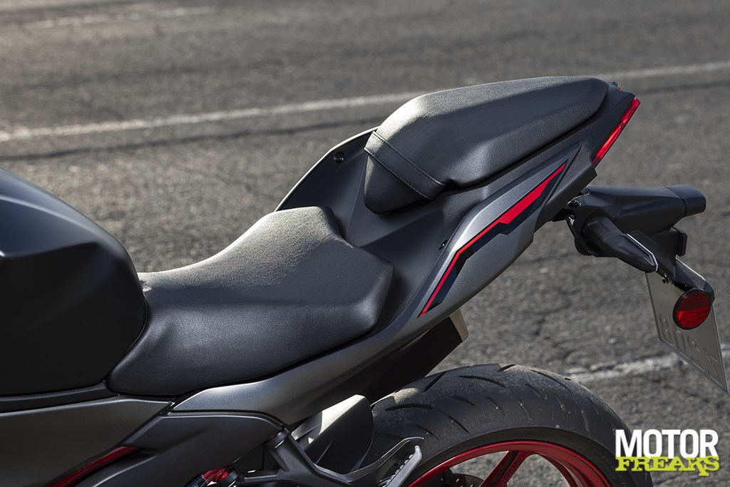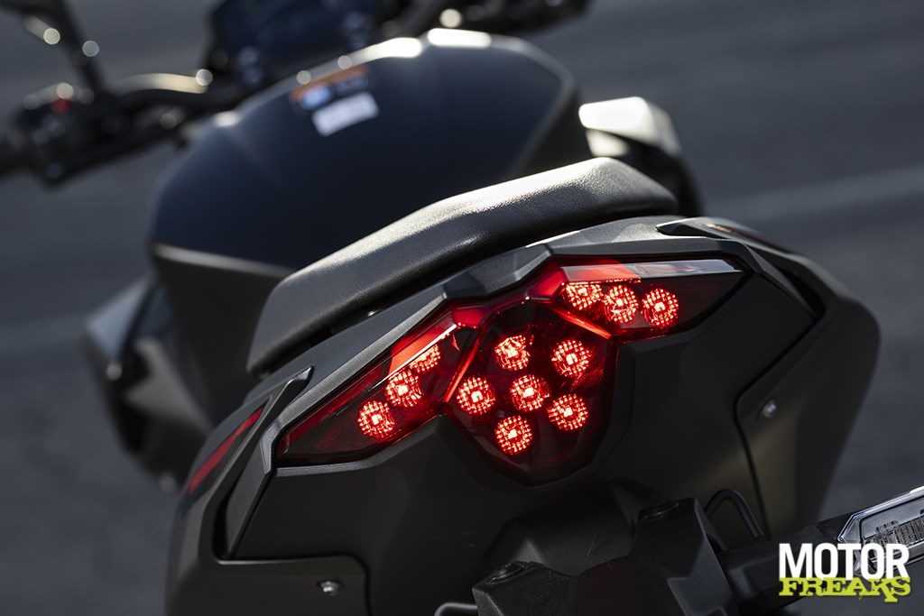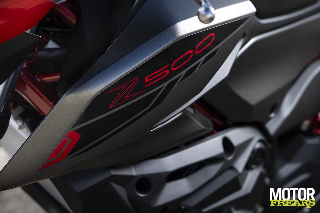 Hoewel nog steeds heerlijk compact voelt de zithouding van de Z500 vanaf de eerste meters een stuk volwassener aan en heb ik zeker niet het gevoel met een uit de kluiten gewassen brommer op pad te zijn. De zithoogte is met 785 mm gelijk gebleven, wel is de vorm van het zadel aangepast. Het voorste deel waar je normaal gesproken zit is nu vlak en loopt daarna schuin omhoog, waardoor het natuurlijker aanvoelt wanneer je je kont naar achteren schuift voor die sportieve zit. De voetsteunen zijn iets naar voren geplaatst, waardoor ik in combinatie met dat vlakkere zadel niet meer het idee heb in een ‘poep-zithouding’ te zitten, zonder daarbij in de weg te zitten wanneer je beide voeten aan de grond zet. Kleine aanpassingen, maar wel met een groot verschil, ik tegenstelling tot z’n voorganger heb ik totaal niet meer de behoefte het zadel om te ruilen voor het 30 mm hogere exemplaar dat als accessoire leverbaar is.