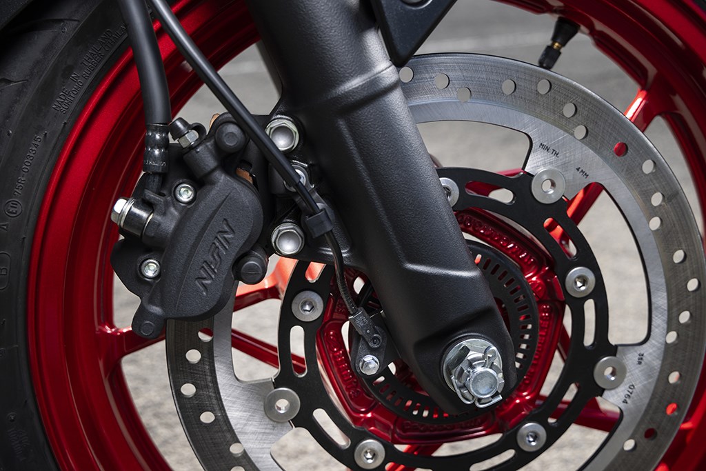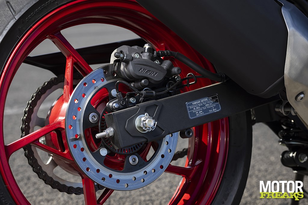 Tot slot de remmen, waar Kawasaki een baanbrekende aanpassing heeft doorgevoerd. Voor het eerst in misschien we meer dan een kwart eeuw tijd (we kunnen het ons eerlijk gezegd niet meer heugen wanneer ze bij Kawasaki werden geïntroduceerd) heeft Kawasaki namelijk de kenmerkende wavedisks vervangen door normale remschijven uit huize Nissin: een 310 mm schijf voor en een 220 mm schijf achter, beide met Nissin tweezuiger remklauw en voorzien van een Nissin ABS unit. De remvertraging is uitstekend, maar verwacht geen een-vinger “oog uit de kas” vertraging à la een Supersport of Hypernaked. De achterrem blijkt bovendien in de bergachtige omgeving zeer nuttig te zijn, waar de bochten soms net effe wat scherper blijken te zijn en met de achterrem de snelheid net dat beetje dat nodig is kan worden gecorrigeerd.