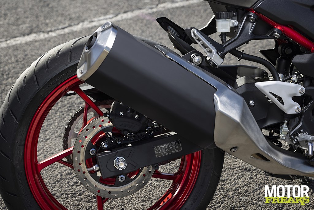Waarmee we meteen zijn aangekomen bij z’n tweede ijzersterke troef: het gewicht. Kawasaki claimt een rijklaargewicht van 167 kilo – 168 kilo voor de door ons gereden SE-versie zoals ‘ie bij ons in de Benelux uitsluitend leverbaar is – en dat is niet alleen exact gelijk als z’n voorganger Z400, maar ook een serieuze en zeer indrukwekkende 23 kilo lichter dan z’n grootste concurrent, de CB500F. Het vakwerkbuisframe, ontwikkeld met behulp van dezelfde software specifiek voor de Ninja H2 was ontwikkeld, heeft Kawasaki zo van de Z400 over kunnen nemen omdat zoals gezegd de contouren van het blok hetzelfde zijn gebleven. Het rijwielgedeelte heeft een Supersport-kenmerkende lay-out van korte wielbasis en lange achterbrug, waarbij het eerste garant staat voor een enorme wendbaarheid en het tweede