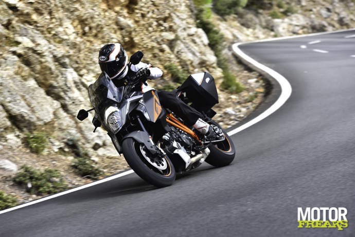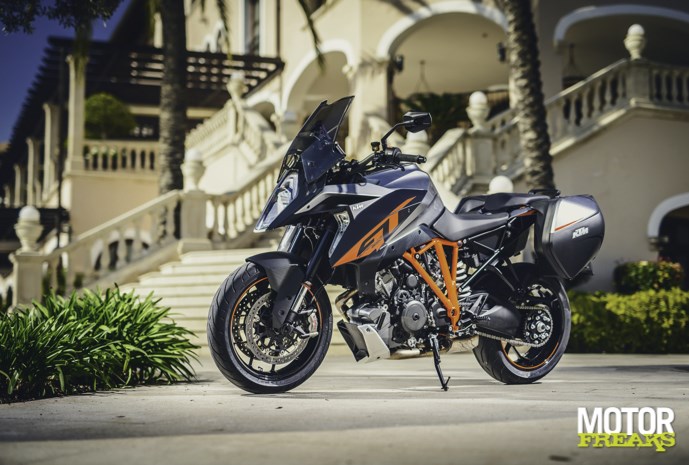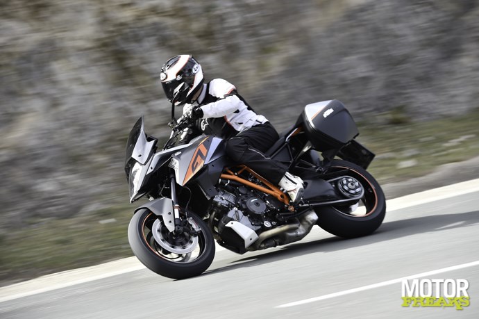 Alleen het beste is goed genoeg voor de GT en dus is de semiactieve vering van de Super Adventure overgenomen en aangepast voor de nieuwe toermotor. Dat moest wel, want de GT heeft kortere veerwegen en moet dus sneller reageren. Door dit systeem kun je nu onderweg het karakter van de vering aanpassen voor meer comfort of juist meer grip. En er is een groot verschil met elektronisch instelbare vering, die zet je op een bepaalde stand en daar blijft het bij: het reageert volgens een bepaalde vooringestelde waarde. Het actieve deel houdt in dat er gereageerd wordt binnen een bepaald spectrum van demping, waarbinnen naar gelang de omstandigheden continu meer en minder wordt gereageerd op wat er onderweg onder de wielen gebeurt. Dit wordt ingegeven door de wens van de rijder dis hetzij comfortabel wil rijden, hetzij sportief. In comfort en street modus reageert het systeem als een soort ‘Skyhook’, de motor wordt zo stabiel mogelijk gehouden en de wielen gaan daaronder op en neer volgens wat wegdek, remmen en accelereren doen. Daarbij wordt er ook een electronische antiduik toegepast, alles om je zo strak mogelijk over de weg te laten zweven. In sportmodus werkt het systeem meer volgens een ‘Groundhook’ principe, wat er juist voor zorgt dat de wiélen onder alle omstandigheden aan de grond vastgeplakt blijven voor optimale grip en drive en beweegt de motor daarboven dus veel meer. Bovendien heb je dan geen antiduik en is de feedback die je krijgt veel natuurlijker. Deze setting komt volgens de heren engineers het dichtst in de buurt van de setting die testrijder Jeremy McWilliams op zijn Superduke R gebruikt.ewtonmeters op het achterste rubber loslaten. En als je dat eenmaal durft word je beloond met een drive waarvan je niet dacht dat het mogelijk was. Wat nou, een beest? Alhoewel, eigenlijk wel dus. Maar dan wel eentje die uit je hand eet. Het is elektronica ten overvloede, maar wel als hulpmiddel, niet als beperking.