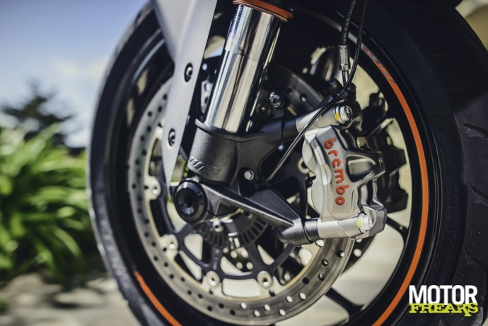 | Voorrem | dubbele schijf 320 mm, vierzuiger Brembo Monobloc M50, C-ABS |