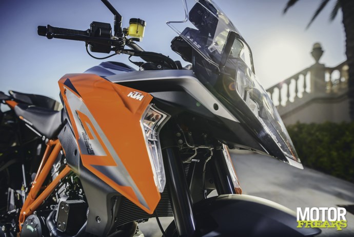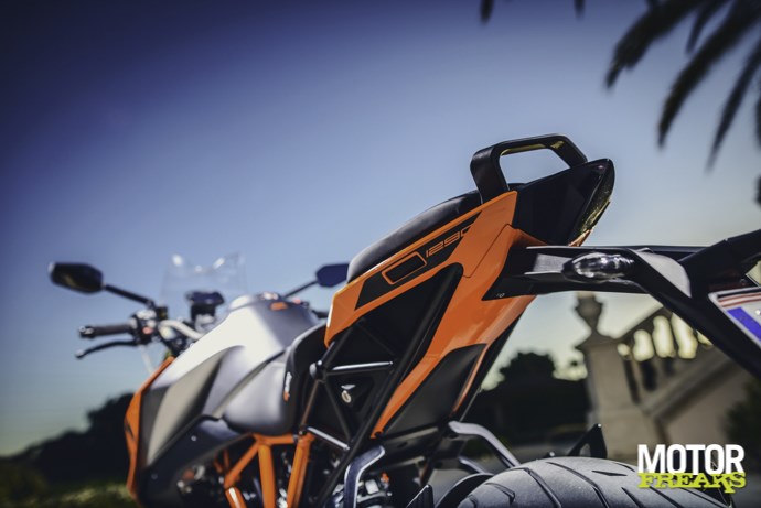 Ook het rijwielgedeelte is direct overgenomen van de Super Duke R. De geometrie is dus identiek en daarmee de rijeigenschappen. Sterker, doordat de koplamp en het dashboard nu niet meer op de voorvork gemonteerd zijn, stuurt ie in principe lichter. Het subframe is iets langer gemaakt om ruimte te bieden voor koffers en meer ruimte te maken voor rijder en passagier. De tank heeft nu een inhoud van 23 liter en is dus groter geworden. Dat is een van de paar dingen die de zithouding iets hebben veranderd ten opzichte van de R: de tank is iets breder tussen de benen, het stuur is iets hoger en 25mm breder, het zadel van de rijder is wat langer en heeft een ander profiel. Wil je nog iets aanpassen, dan is het stuur nog in vier standen verstelbaar. Dit zijn volgens KTM veranderingen die ‘m nog comfortabeler maken op lange stukken. Let wel: dit is een ander soort comfort als de luxe toermachines, het zadel is nog net zo hard als voorheen en ook de aanvalshouding is gebleven, zo niet versterkt. Maar neem bijvoorbeeld de afstand tussen zadel en voetsteunen, die is identiek aan de Superduke R.
