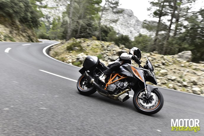 Er is flink nagedacht over de koffers , dat zie je eigenlijk pas als je ze verwijdert..e switchen tussen Sport, Street en Rain. De tractioncontrol wordt daarbij mee aangepast, maar kan ook onafhankelijk uitgeschakeld worden (net als bij de Superduke R), het ABS idem: naar wens kun je switchen tussen gewoon C-ABS, Supermotomode (waarbij ABS op het achterwiel is uitgeschakeld voor de betere slides) en geheel uit. En nog steeds hebben we het over een toermachine.