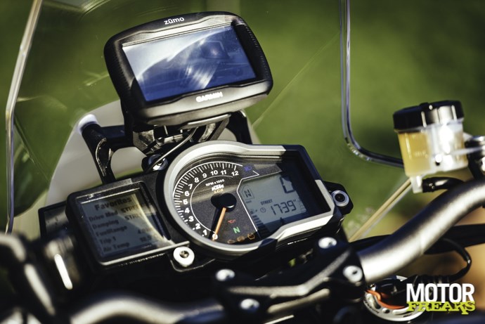 Dan hebben we nog de luxetrucjes als de standaard handvatverwarming en bandenspannings-indicatie, optioneel aangevuld met Hill Hold Control voor probleemloos wegrijden op een helling en Motor Slip Regulation die de mate van motorrem in meerdere standen controleert. Voor de lange afstanden is er standaard cruise control en een met één hand verstelbare ruit, voor de bochten zijn er net als bij de Super Adventure automatische LED Cornering Lights die je bijstaan in de donkere hoeken van je blikveld. In dezelfde unit geïntegreerd zijn de knipperlichten die nu een automatische cancelling functie hebben. Leuk voor onze hoofdredacteur.