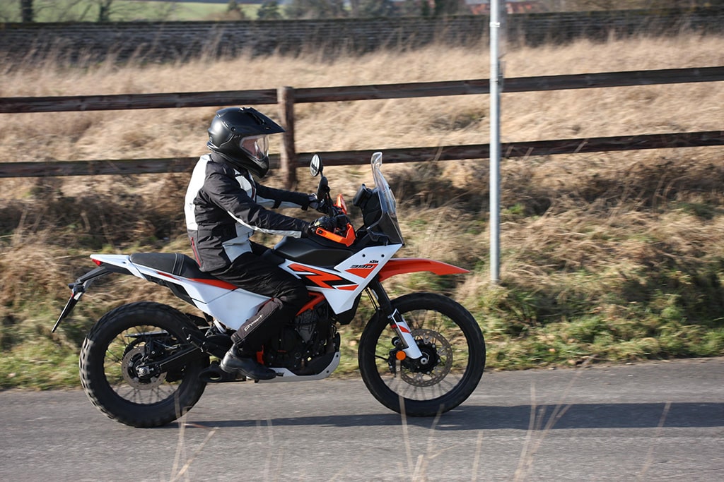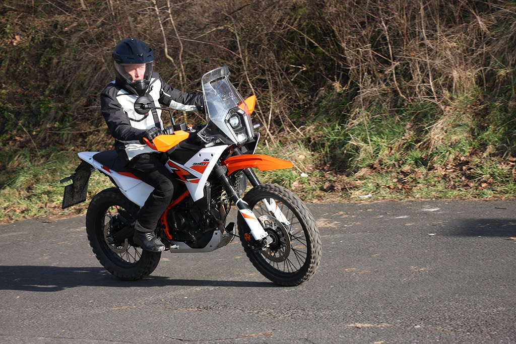 Op asfalt zorgt deze eigenschap van de Adventure zelfs voor een redelijk sportieve uitstraling, dankzij de veerwegreserves van het rijwielgedeelte. Zijn 178 kilo volgetankt laat zich moeiteloos door de bochten jagen, de fiets voelt altijd beheersbaar en betrouwbaar aan. Dit verandert echter niets aan het stugge – kenmerkende – gedrag van een Offroad met een klassieke 21/18 inch bandenmix en lange veerwegen die worden verbonden door een typisch KTM-buizenframe. Met hun grove offroad-profiel rollen de Mitas-banden over het asfalt, maar bieden wel voldoende grip. Ze sturen de 390 voldoende nauwkeurig en neutraal over het terrein, alleen de lange veerwegen zorgen bij een sportieve rijstijl voor enige onrust.