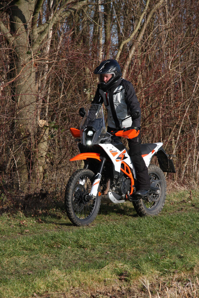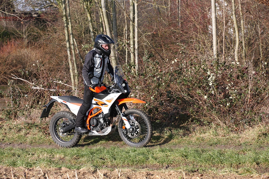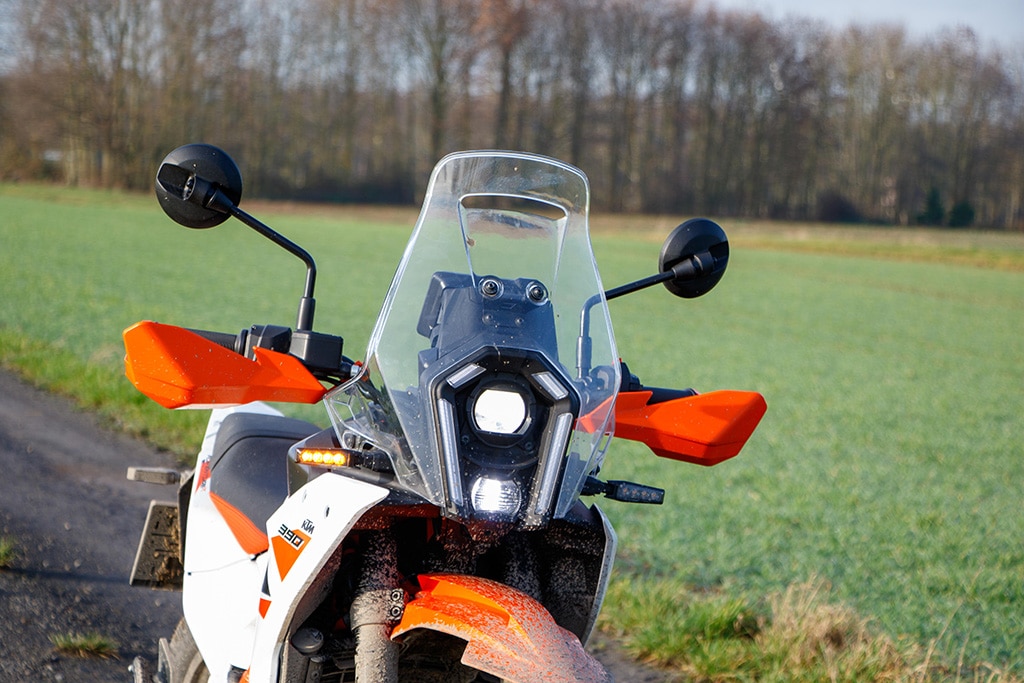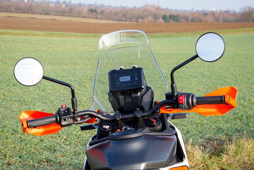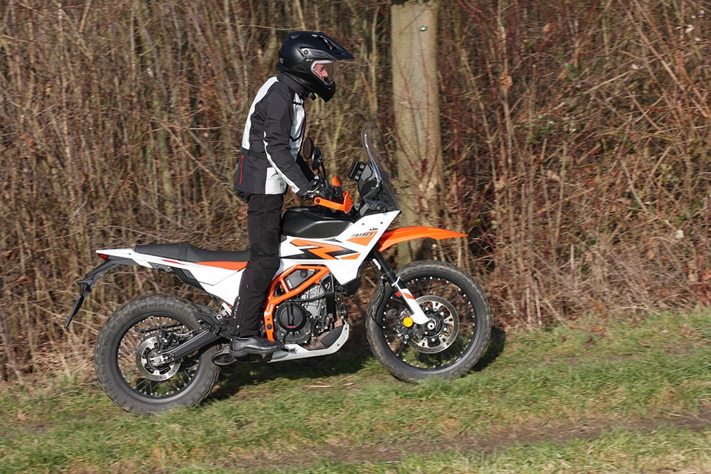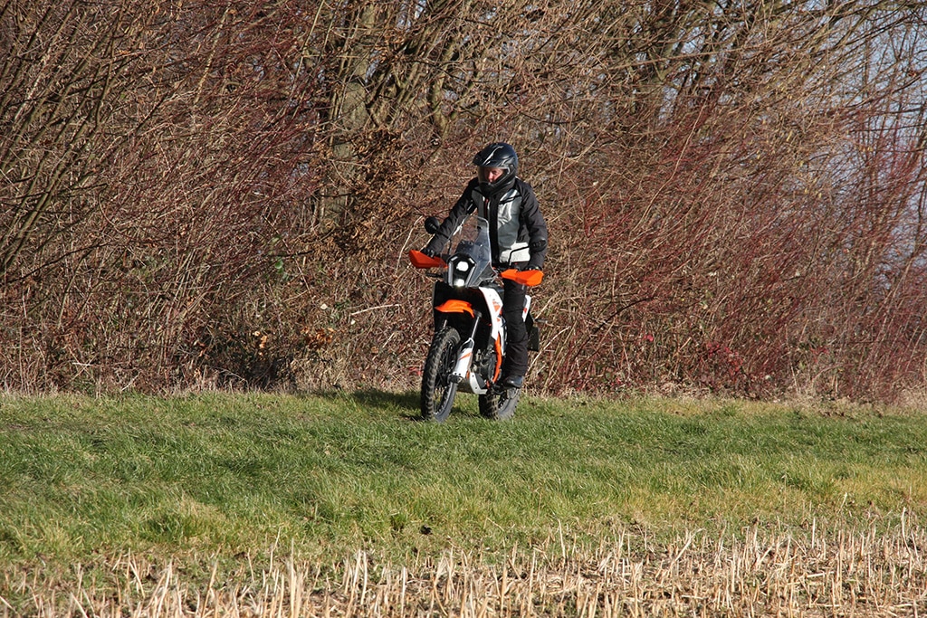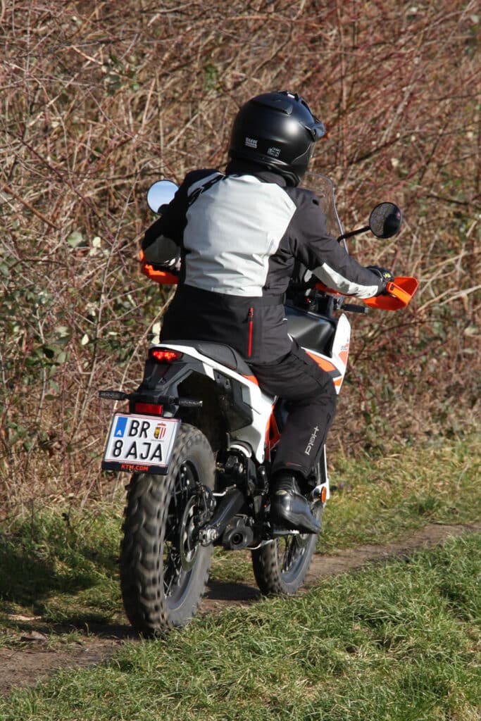 Offroad voelt de 390 Adventure zich daarentegen beduidend beter in z’n element. De tanden van de voetsteunen grijpen stevig in de laarzen, de smalle taille geeft de benen prima steun en de armen grijpen licht voorovergebogen naar het stuur. Het TFT-display geeft de offroad-modus aan met ABS aan de voorkant uitgeschakeld, tractiecontrole aan de achterkant uitgeschakeld en