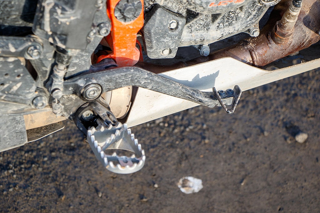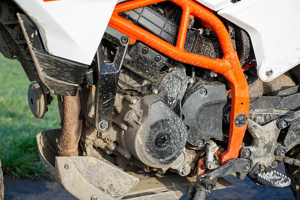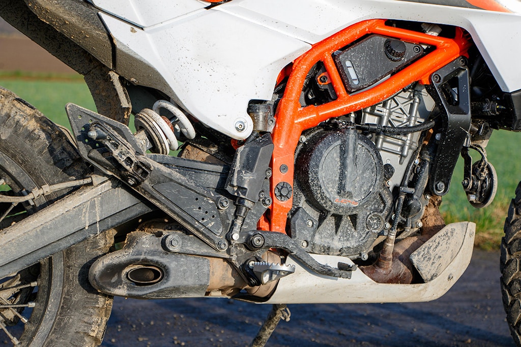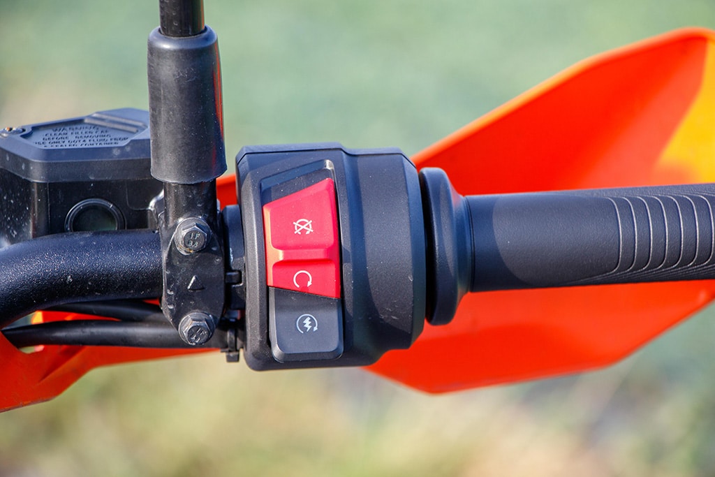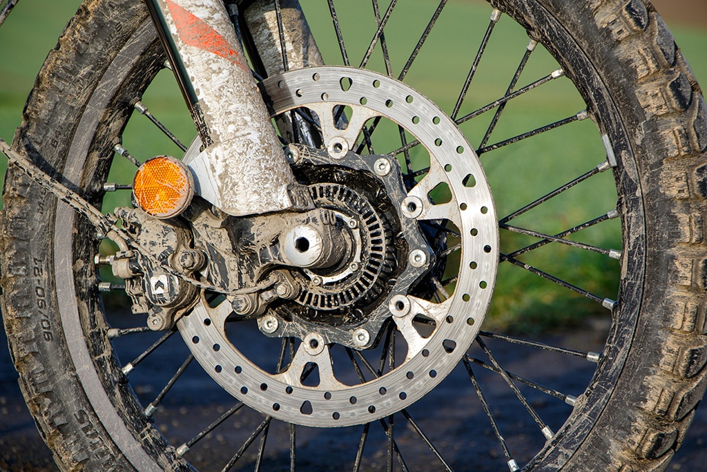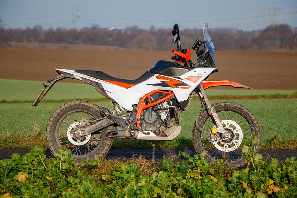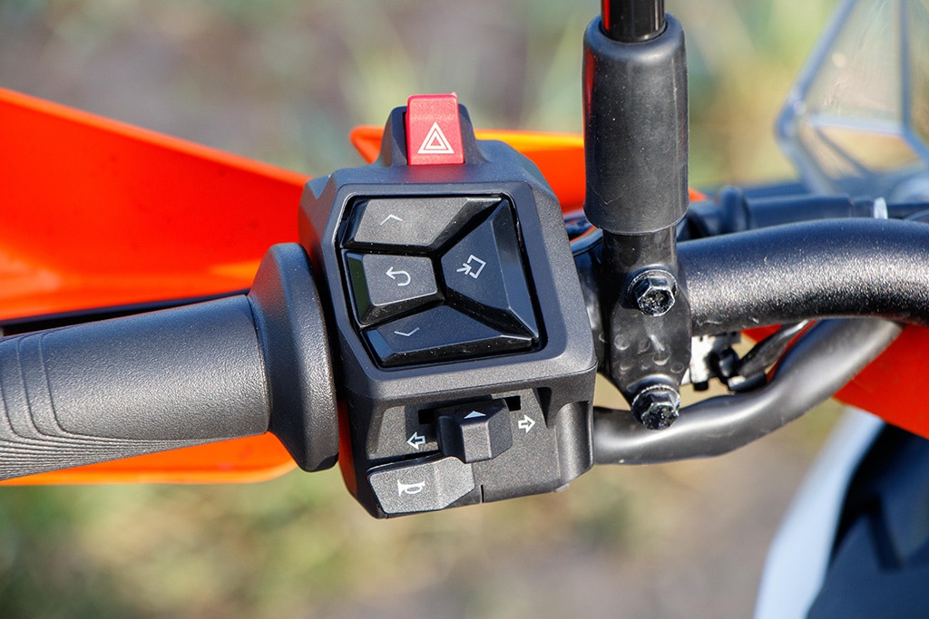 Offroad voelt de 390 Adventure zich daarentegen beduidend beter in z’n element. De tanden van de voetsteunen grijpen stevig in de laarzen, de smalle taille geeft de benen prima steun en de armen grijpen licht voorovergebogen naar het stuur. Het TFT-display geeft de offroad-modus aan met ABS aan de voorkant uitgeschakeld, tractiecontrole aan de achterkant uitgeschakeld en