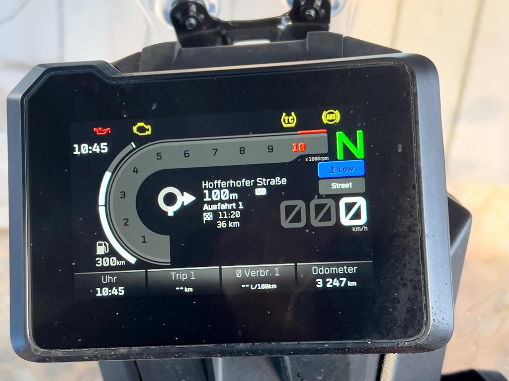 De geïmplanteerde elektronica zorgt toch voor een beetje moderniteit, wat terug te zien is in het goed afleesbare TFT-kleurendisplay: de 390 Adventure beschikt over drie rijmodi, die het gebruik van de hellingshoekafhankelijke tractiecontrole, het bochten-ABS en de gasrespons van de motor bundelen. Deze kunnen, net als alle andere functies, eenvoudig en snel worden bediend met de vier knoppen links op het stuur en in het submenu worden geconfigureerd – alleen de respons is helaas gekoppeld aan de rijmodus en kan dus niet los worden geregeld.
