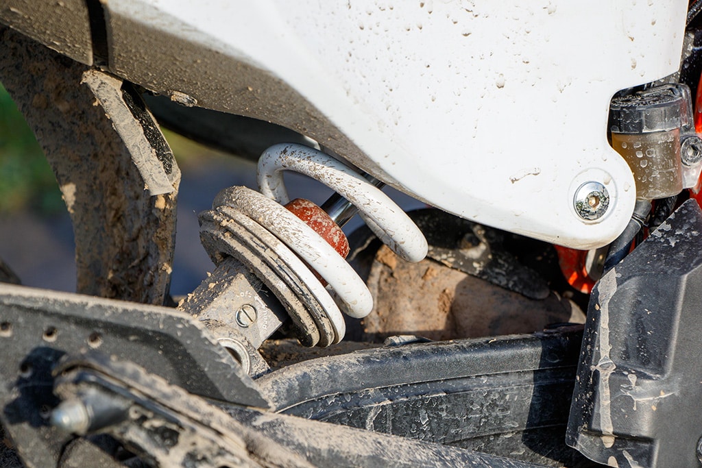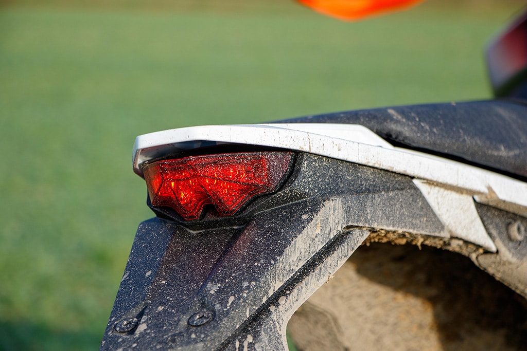 De smalle Mitas-banden van het type Enduro Trail+ E-07+ ontwikkelen zelfs op lastige ondergronden nog acceptabele rijeigenschappen. Diepe groeven, kuilen of andere oneffenheden worden opgevangen door de royale veerweg van de vering en bevorderen het comfort. Het lage gewicht en de goede gewichtsverdeling bevorderen de controle en het zelfvertrouwen. Bovendien neemt het robuuste en puristische ontwerp de angst voor eventueel contact met de grond weg, want indien nodig is de slanke motor snel weer op te tillen. En in de modder vinden zelfs de terughoudende remmen vrienden.
