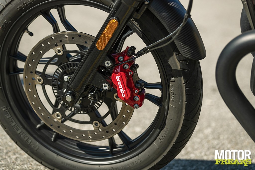 | Voorrem | enkele schijf 320 mm, Brembo vierzuiger remklauw, ABS |
