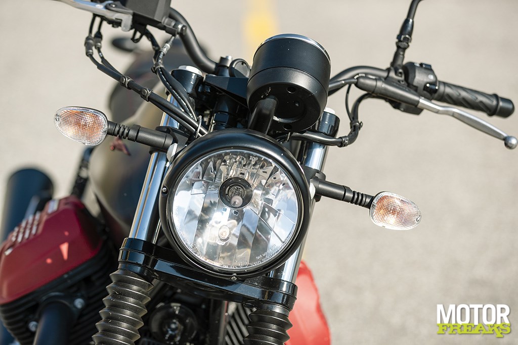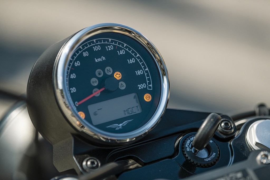 De zit is trouwens prima voor elkaar, het zadel is ten opzichte van de V7 II met 20 mm nu naar een zithoogte van 770 mm verlaagd en is daarmee – zeker voor de kleine motorrijd(st)ers onder ons – nog toegankelijker, zodat dat dit ten koste van de comfortabele zithouding is gegaan. Het boven de kroonplaat op risers gemonteerde licht omhoog gebogen stuur ligt lekker in de hand en is precies breed genoeg om de juiste hefboomwerking te realiseren om de V7 III met speels