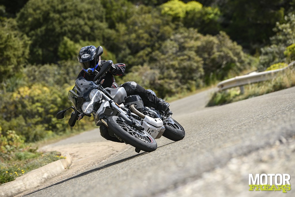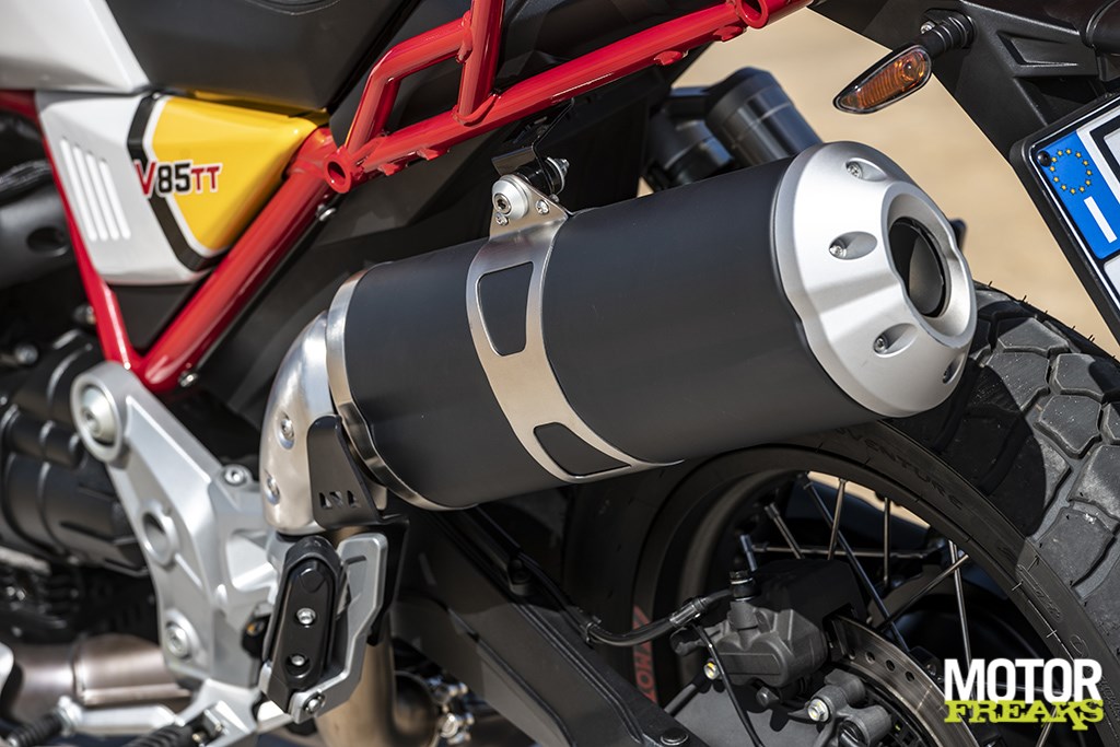 De remmen komen uit huize Brembo, dat voor twee 320 mm schijven heeft geleverd, met radiaal gemonteerde vierzuiger remklauwen, terwijl het achterwiel met een 260 mm schijf en tweezuiger remklauw wordt afgeremd. Guzzi claimt een drooggewicht van 208 kilo, inclusief alle vloeistoffen en een volle tank brengt de V85 TT 229 kilo op de schaal. Het kleine windscherm kan niet in hoogte worden gesteld, maar kan wel worden gekanteld om de luchtstroom – en daarmee de turbulentie rond je hoofd – aan te passen. In de jaren ’80