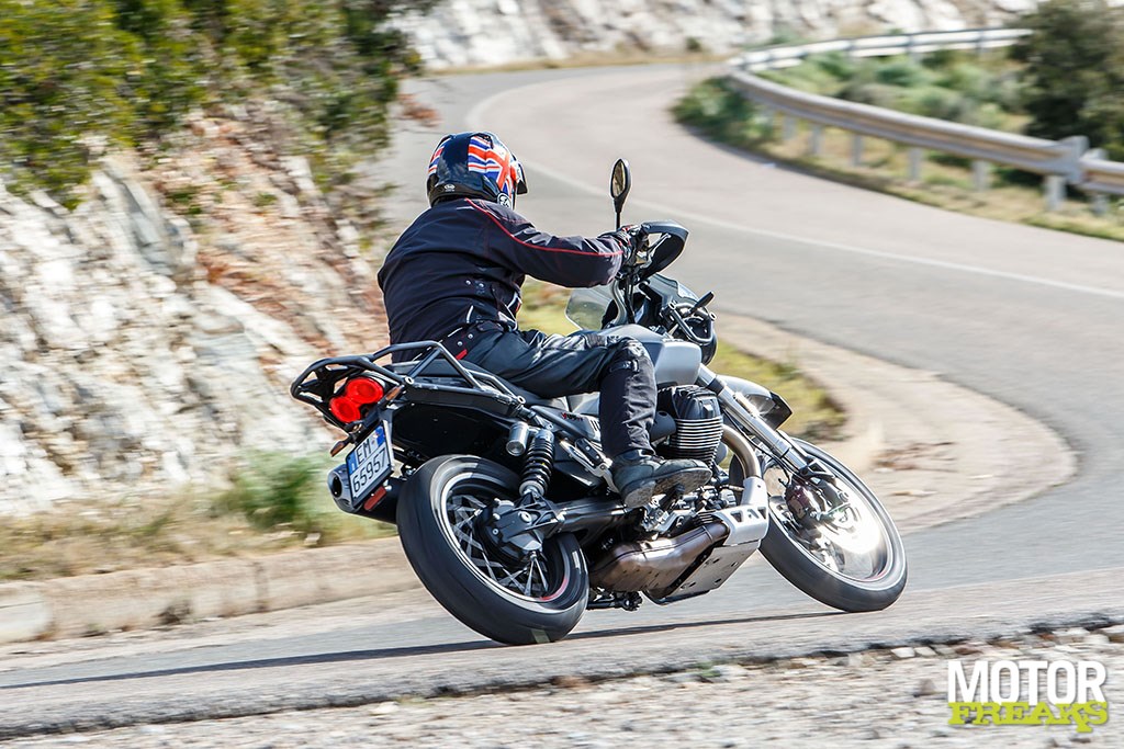 Nu moet daar wel een kleine kanttekening bij worden geplaatst. Hoewel het blok van onderuit mooi oppakt wordt ‘ie pas echt sterk wanneer je de 3.500 tpm bent gepasseerd, dan is het blok sterk genoeg om er echt vandoor te gaan. Rijdt in zesde versnelling minder toeren dan dat en het blok voelt ietwat traag aan. Je wordt dus aangemoedigd om de boterzacht schakelende versnellingsbak te gebruiken – ik kan me niet herinneren wanneer ik voor het laatst deze woorden heb gebruikt om een Guzzi versnellingsbak te omschrijven – om het blok op toeren te houden. Doe dat en je wordt verwend met een heerlijke respons, wat in mijn geval betekende dat ik het grootste deel van de trip in vierde versnelling reed –