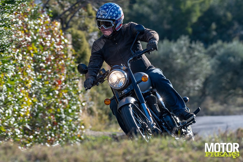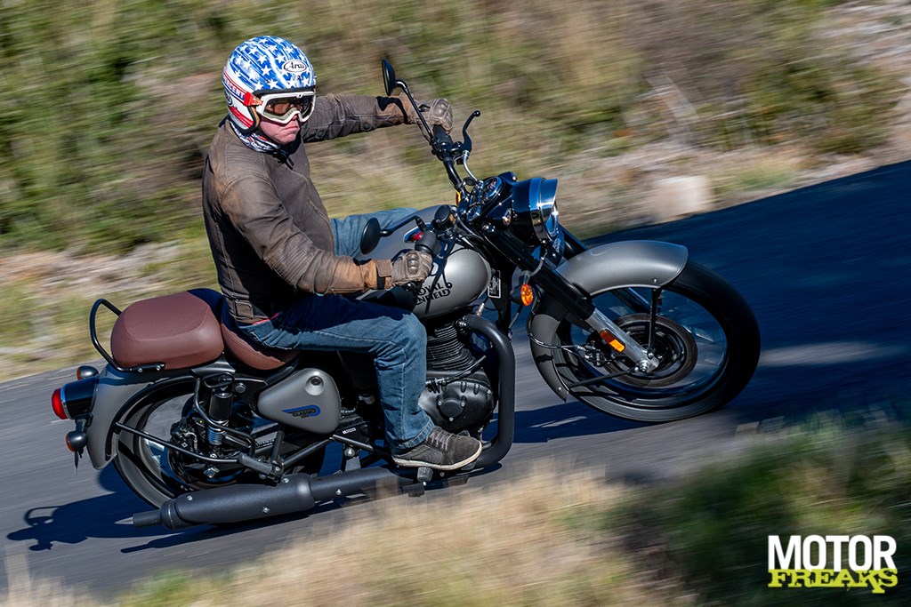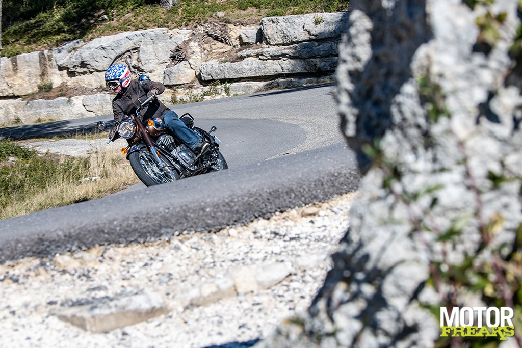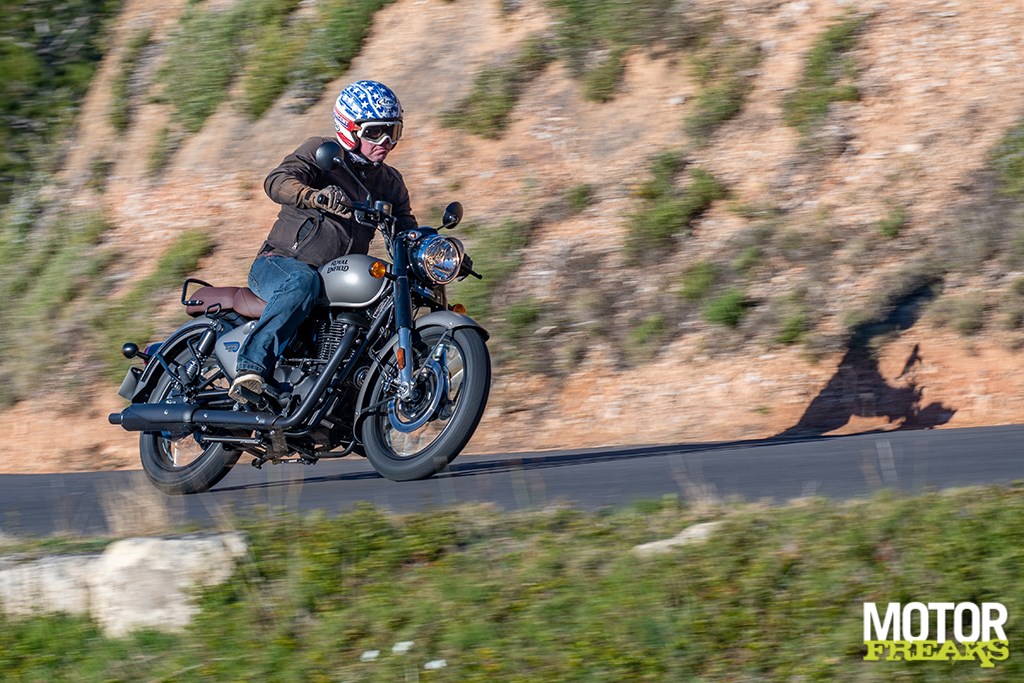 Het eerste wat me opvalt wanneer we door de prachtige bergachtige omgeving aan het kronkelen zijn is hoe ontzettend gemakkelijk en lichtvoetig de Classic 350 van richting te veranderen is. De combinatie van een korte wielbasis en smalle banden (de achterband is 2 cm smaller dan die van de Meteor 350) is hier ongetwijfeld debet aan. Het blok pruttelt (ploft is voor een 349cc een net iets te groot woord) lekker tussen je benen en doet dat nagenoeg trillingsvrij dankzij de enkele balansas. Ondanks ‘slechts’ 20,2 pk voelt het blok niet echt timide aan, maar dat komt grotendeels ook doordat ‘ie van voor tot achter ‘onthaasten’ uitstraalt. Gewoon lekker ontspannen van je rit genieten, in plaats van voor de snelste ‘rondetijd’ te gaan.