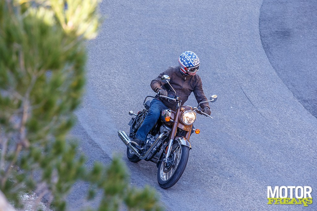 Of er dan helemaal niets op de motor is af te dingen? Zeker wel, maar tegelijkertijd heeft ‘ie een aaibaarheidsfactor die alle minpunten meteen relativeert. Laat ik beginnen met de vering, waar ik persoonlijk een andere afstelling zou hebben geprefereerd. De voorkant voelt behoorlijk stug, waardoor oneffenheden in het wegdek direct worden doorgegeven, maar je zou ook kunnen stellen dat het een teken aan de wand is dat het asfalt écht aan vervanging toe is. De achterkant had daarentegen als je ’t mij vraagt iets straffer mogen zijn, wanneer je besluit om in van-dik-hout stijl die fraaie bergweg af te raggen, dan voel je wel beweging in de achterkant, maar ergens past ‘m dat wel. Enerzijds omdat het de Classic lekker levendig maakt en anderzijds omdat ‘ie wél z’n mannetje staat en het geen enkel moment in een ‘holy shit’ moment resulteert. Wat de remmen betreft sluit het gevoel van de voorrem naadloos aan bij wat je van een retro-classic verwachten mag, een beetje vaag maar wel met voldoende remkracht wanneer je doorknijpt. De achterrem daarentegen voelt juist behoorlijk fel, waardoor het net lijkt alsof ‘ie achter harder remt dan voor. Dat voelt in eerste instantie ietwat vreemd aan, maar tegelijkertijd rijd je dus wel in de wetenschap dat de achterrem écht wat doet en dat is toch echt heel wat beter dan dat rempedaal intrappen en constateren dat er amper iets gebeurt.