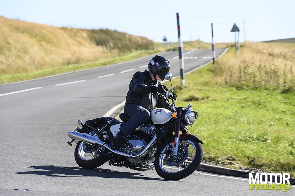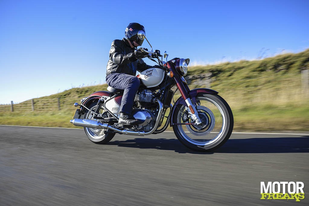 De Enfield Classic twin is gemakkelijk en precies de bocht in te sturen. Hij valt niet zomaar de bocht in, maar komt evenwichtig binnen om te doen wat je hem opdraagt in termen van bochtsnelheid - hoewel je de slijtboutjes aan de onderkant van de opklapbare voetsteunen zult doen slijten. Dit sturen vraagt op zijn beurt veel van de dunne 100/90-19 voorband, en ik was behoorlijk onder de indruk van het MRF-rubber waarmee ik nog nooit eerder had gereden, dat als lijm aan het asfalt plakte met veel zijdelingse grip en een goede feedback die de Pirelli-technologie waardig is die blijkbaar is gebruikt om het speciaal voor deze motorfiets te ontwerpen.