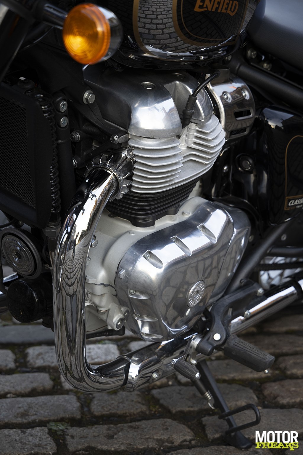 Net als zijn Shotgun en Super Meteor zustermotoren wordt de Classic aangedreven door dezelfde lucht/oliegekoelde 648cc paralleltwin met acht kleppen en SOHC, die is ontwikkeld als joint venture tussen het in 2017 geopende Royal Enfield UK Tech Centre in Bruntingthorpe, vlakbij Leicester, en het Indiase R&D Centre in Tiruvottiyur, vlakbij het hoofdkantoor van de onderneming - het tijdsverschil van 4½ uur tussen beide verlengt de werkdag aanzienlijk. De twin is uitgerust met een enkele, door tandwielen aangedreven balansas om de trillingen van de motor te verminderen, waarvan de 270° krukas uit één stuk is gesmeed voor extra sterkte en duurzaamheid. Met boring x slag van 78 x 67,8 mm en een centrale nokkenasaandrijving produceert deze brandstof-ingespoten twin met een Bosch ECU en dubbele 34 mm Mikuni gasklephuizen 47 pk bij 7.250 tpm aan de krukas, terwijl het maximumkoppel van 52,3 Nm wordt geleverd bij 5.650 tpm. De zesversnellingsbak is voorzien van een slipkoppeling, terwijl de vrij lage compressieverhouding van 9,5:1 duidt op een laag toerental, waarschijnlijk om ervoor te zorgen dat de motor goed loopt, zelfs op brandstof van slechte kwaliteit, bij een geclaimd verbruik van 22 km/u.