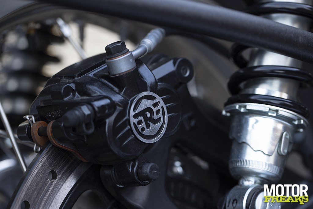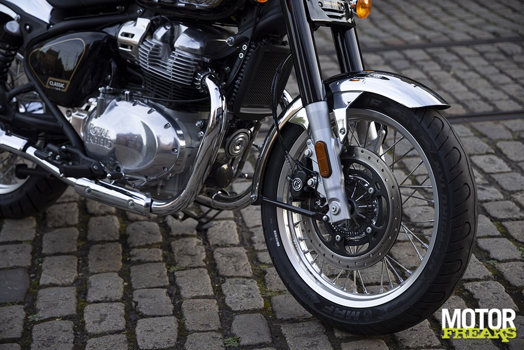 maar 25 mm korter dan die van de 1.500 mm Super Meteor, deels vanwege de bandenmaat. De nieuwe twin heeft een 19-inch MRF Nylohigh FN - nee, ik ook niet - 100/90 voorband en een 140/70-18 achterband. De remmen bestaan uit een enkele 320 mm schijf voor en een 300 mm schijf achter, elk voorzien van een ByBre zwevende tweezuiger remklauw met standaard tweekanaals Bosch ABS. De Classic weegt volgens Enfield 243 kg met een 90% volle brandstoftank van 14,8 liter, terwijl het 800 mm hoge zadel de meeste klanten in staat stelt om beide voeten plat op de vloer te zetten als ze stilstaan.