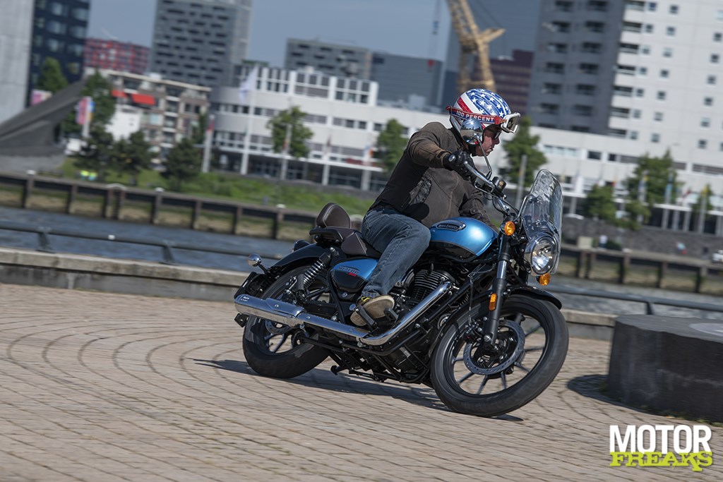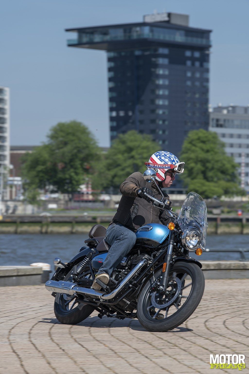 We beginnen de dag in de stad op de Supernova Blue, het meest complete basismodel dat naast een zeer fraaie two-tone kleurschema standaard van een windscherm en sissybar is voorzien. Het eerste dat me opvalt zodra ik mijn been over het zadel heb gezwaaid is dat de motor dankzij z’n lage zit van slechts 765 mm echt super toegankelijk is, maar dat de zit minder ‘cruiser’ is dan ik op voorhand had verwacht. Ja, je zit redelijk onderuit en dat werkt met name wanneer je op tempo drempels wilt nemen niet in je