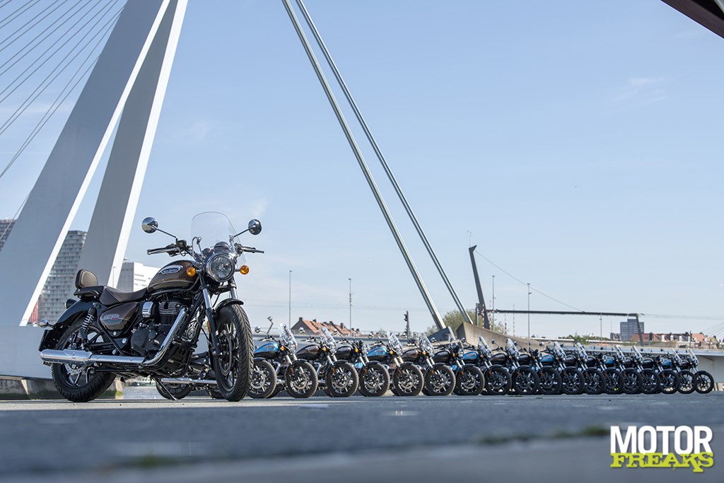 Nu zou dat ritje Amsterdam – Parijs voor de presentatie van de Meteor 350 echt supervet zijn geweest, maar begrijpelijkerwijs hield Enfield het een stuk dichter bij huis. Tenminste, voor het Nederlandse journaille dan, voor de Belgische en helemaal voor de Franse collega’s ligt Rotterdam toch echt in het buitenland. Vanuit Café Rotterdam aan de Wilhelminakade, waar vroeger de Holland Amerika lijn was, was ’s ochtends een trip dwars door de stad naar ss Rotterdam uitgezet, waarna ’s middags koers richting de windmolens van Kinderdijk werd gezet.