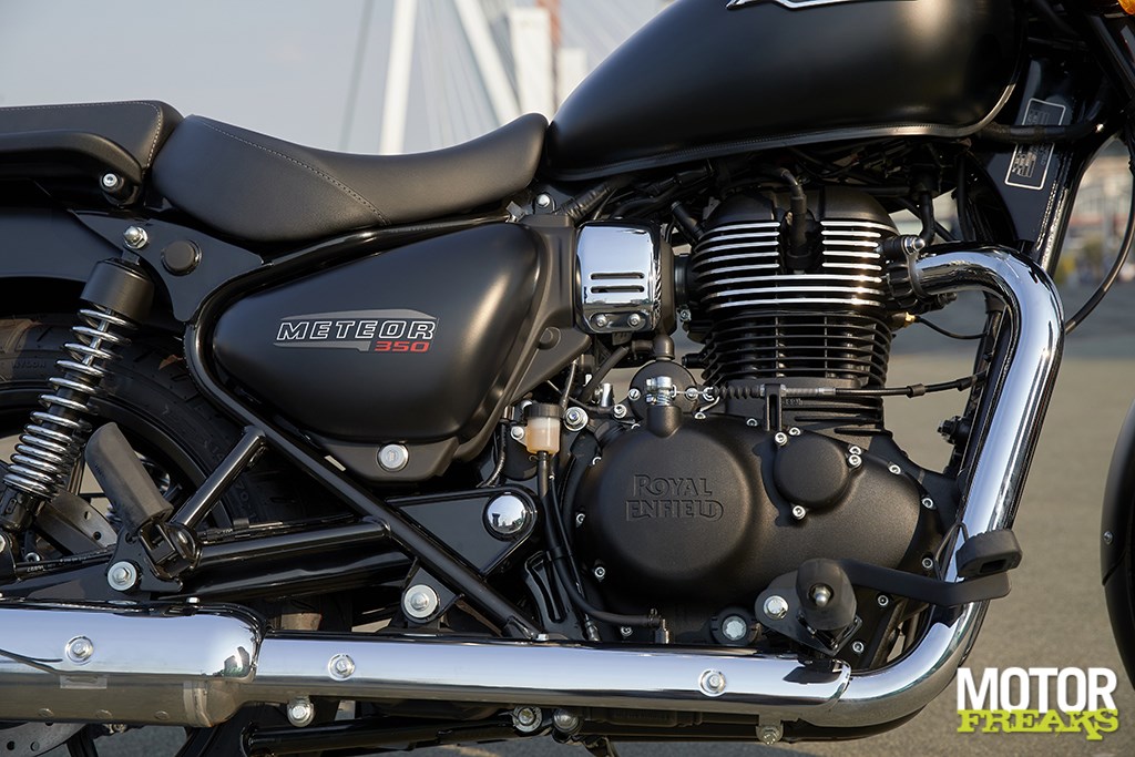 Strikt genomen volgt de Meteor 350 dus de Thunderbird op, die in 2020 uit productie is genomen. Ontwikkeld onder de codenaam JD1 wordt de Meteor 350 aangedreven door een langeslag eencilinder met enkele bovenliggende nokkenas en twee kleppen die z’n cilinderinhoud van 349 cc uit een boring x slag van 72 x 85,8 mm haalt. Het blok heeft een compressieverhouding van 9,5:1 en dat lijkt in een wereld waar 13:1 (of zelfs nog hoger) gemeengoed lijkt te worden aan de lage kant, maar heeft als grote voordeel dat het blok ook bij slechte kwaliteit benzine nog steeds ontzettend goed presteert. De kleine eencilinder is goed voor een topvermogen van 15 kW, ofwel 20,1 pk bij 6.100 tpm en een koppel van 27 Nm bij 4.000 tpm en ook dat zijn geen cijfers waarmee je aan de toog van je lokale kroeg de blits mee zult maken, net als z’n geclaimde topsnelheid van 114 km/u, maar dat heeft bij Enfield ook totaal geen prioriteit gehad. De Meteor 350 is een motor die je koopt om wat je ermee wilt doen, niet om wat dat ‘ie kan, waar van het overgrote deel van wat je anno 2021 kopen kunt het tegenovergestelde kan worden gezegd. Een Streetfighter V4 (om maar eens een model te noemen) koop je niet om wat je ermee wilt doen, maar om wat ‘ie kan