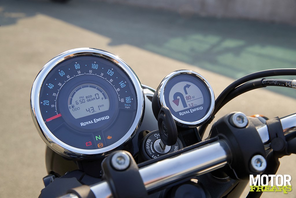 Vanuit het zadel heb je zicht op het dashboard dat uit twee ronde tellers bestaat. De grote teller links is een combinatie van analoge snelheidsmeter met daarin een digitaal display waaruit de brandstofmeter, versnellingsindicator, een klokje en 2 tripmeters af te lezen is, terwijl in de kleine teller rechts de Tripper navigatie is ondergebracht welke via Bluetooth met de Royal Enfield app te verbinden is, welke het opmerkelijk genoeg pas doet als je een account hebt aangemaakt. Eenmaal ingelogd kan via de op basis van Google Maps werkende routeplanner eenvoudig een eindbestemming worden geselecteerd en kunnen tussenpunten worden toegevoegd, waarna in het display de route-aanwijzingen worden getoond. Het systeem werkt echt super intuïtief, maar dat de app nog niet helemaal is uitontwikkeld blijkt uit het feit dat er al wel een knopje ‘mijn routes’ in zit, maar dat die nog niet is geactiveerd.