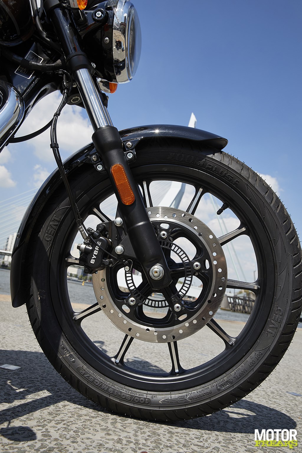 Maar niet voordat eerst de Meteor 350 verder wordt uitgediept. Het zojuist besproken compleet nieuw ontwikkelde motorblok is in een eveneens nieuw ontwikkeld rijwielgedeelte gemonteerd dat volgens Enfield sterker, stijver en duurzamer is dan het frame van de Thunderbird en is ontworpen voor rechtuit stabiliteit, bochtenwerk en wendbaarheid. Spoiler alert: daar is geen woord van gelogen, maar daarover straks meer. Over het rijwielgedeelte zelf wordt door Enfield weinig uit de doeken gedaan, behalve dat de wielbasis met 1.400 mm lekker kort is gehouden en dat ‘ie voor 130 en achter 90 mm veerweg heeft, voor een enkele 300 mm schijf met tweezuiger remklauw en achter een 270 mm schijf met eenzuiger remklauw. Beide schijven zijn trouwens zwevend opgehangen. Het cruiseridee is terug te vinden in de gekozen wielmaten: 19 inch voor en 17 inch achter.