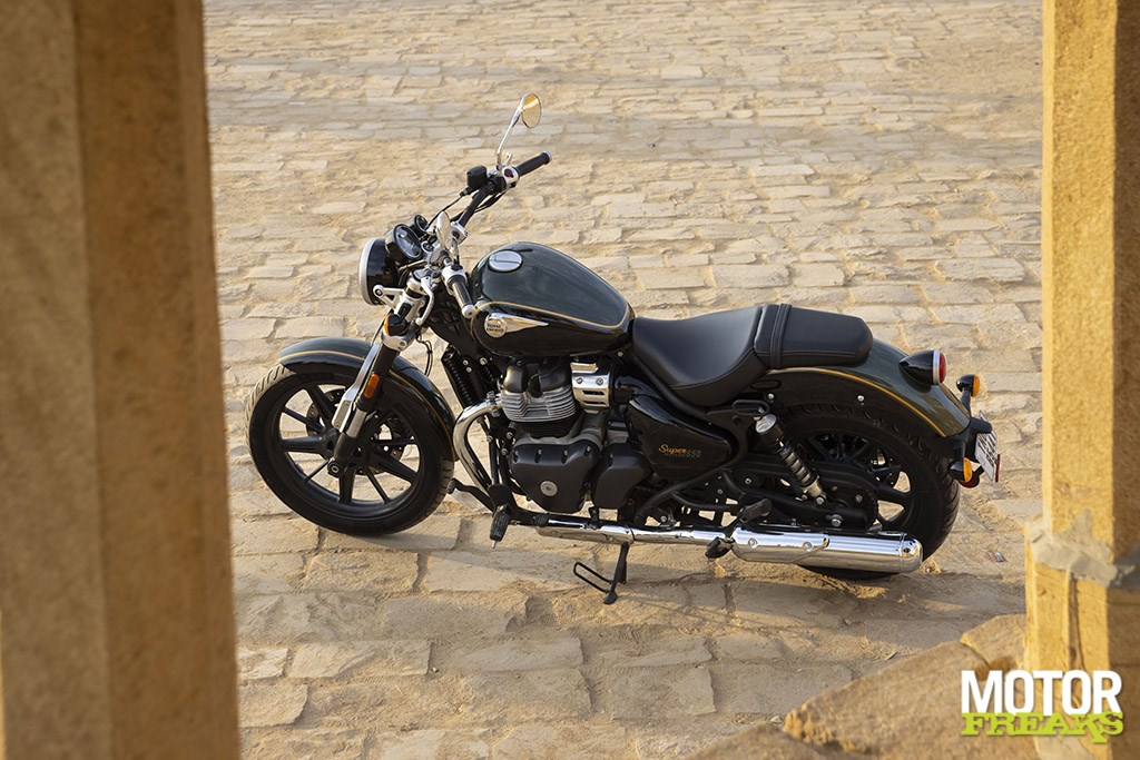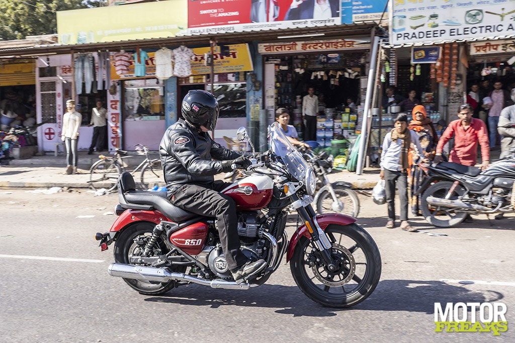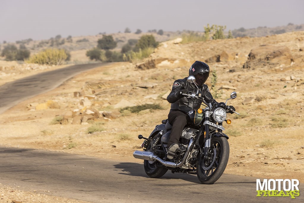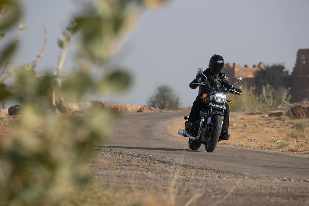 Net als bij de bestaande 650 modellen is de paralleltwin absoluut de ster van de show bij de Super Meteor voor wat betreft het rijgenot, want dit is een middenklasse motor die groot denkt. Hij is slim ontwikkeld om alles te zijn voor alle rijders, zodat minder ervaren motorrijders er de hele dag in vierde versnelling mee rond de stad kunnen rijden en het superflexibele blok dat toelaat zonder te hikken of verslikken. Aan de andere kant van de performance schaal is het echter ook een willige partner om mee door het weidse buitengebied van Rajasthan te blaffen. Je vergeet nooit dat het ‘maar’ een 650 is, omdat hij simpelweg niet het koppel of het vermogen van een 900 twin of zelfs een 750 heeft. Dat is echter oké, want de Royal Enfield motor nodigt je uit om hard te werken om er snel mee te gaan, wat ‘ie vervolgens ook gewillig doet. Gewoon maximaal gebruik maken van de lichte slip-assist koppeling en de soepele en precieze versnellingsbak om het blok op toeren te houden, en je wordt beloond met een behoorlijk indrukwekkende performance. Voor een zesenhalf dan hè. Het is een gewillige partner waarmee het in beide uitvoeringen kei gaaf is om hard te gaan.