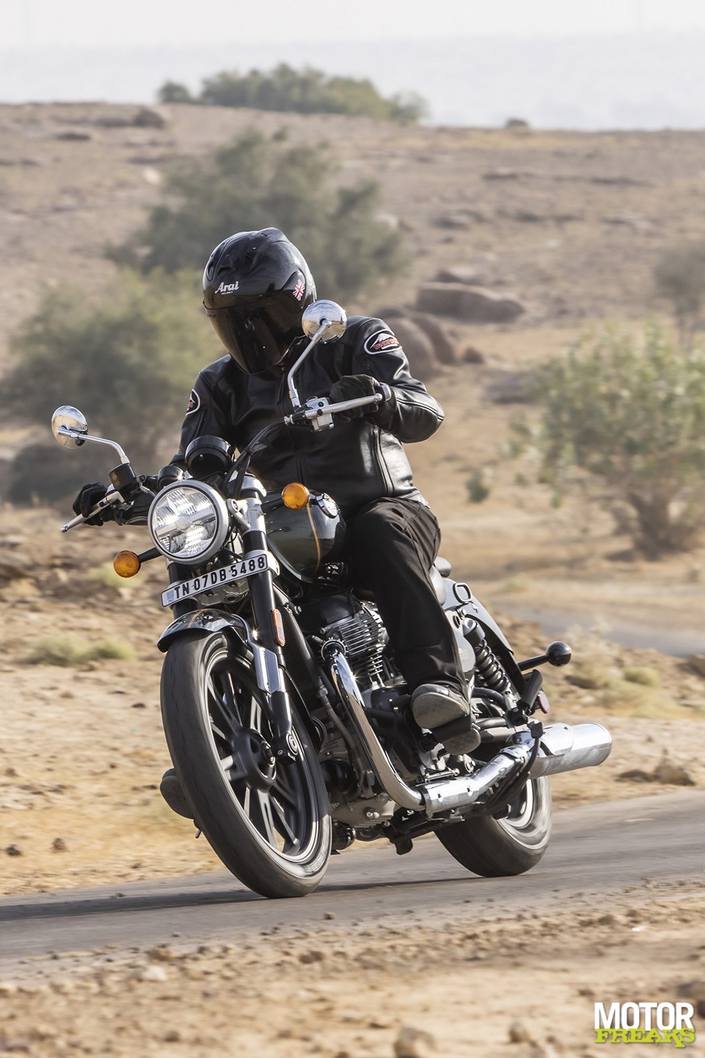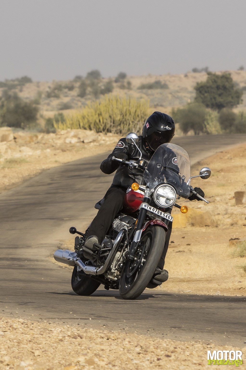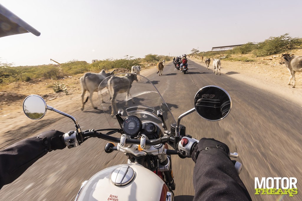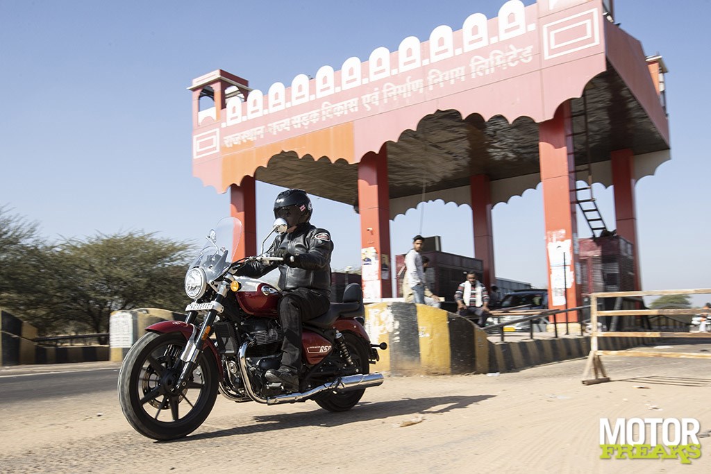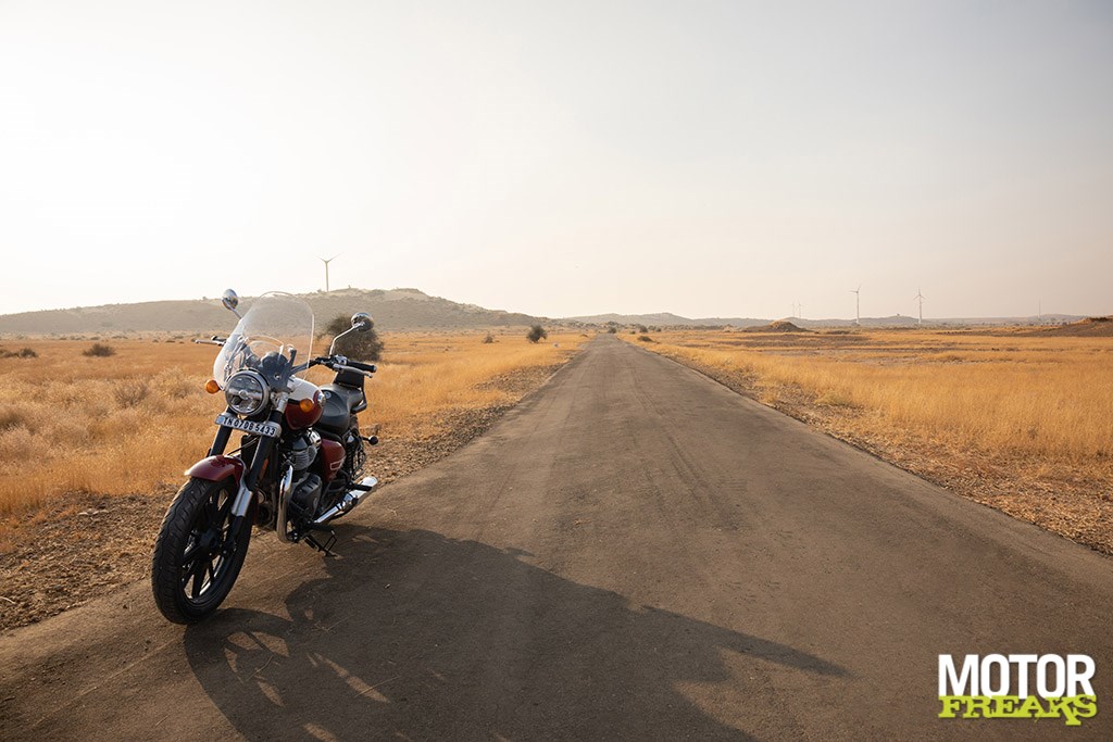 Cruisen krijgt een heel andere dimensie in Indiade Nuclear Weapons Club, kwamen de langeafstandscapaciteiten van de Super Meteor optimaal tot uiting tijdens een glorieuze winterochtend met stralend blauwe lucht. Ik had echter gewild dat onze testmotoren van handvatverwarming waren voorzien, want bij 8°C ochtendgloren begonnen mijn vingers bij dit soort snelheden al snel onderkoeld te geraken, voordat de zon hoog aan de hemel kwam en de woestijntemperatuur naar een aangenaam niveau steeg.