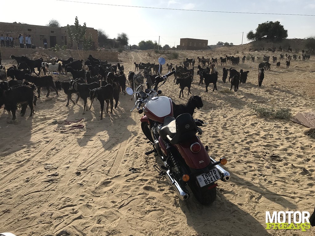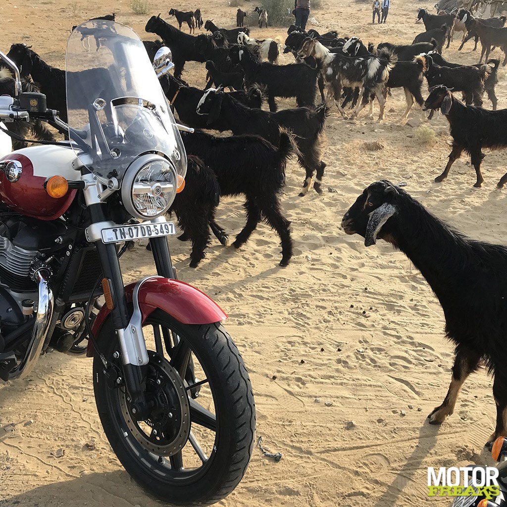 Die laatstgenoemde wegen zijn ongetwijfeld met het leger in het achterhoofd aangelegd, aangezien onze basis in de stad Jaisalmer in het westen van Rajasthan lag, zo dicht als je 75 jaar na de verschrikkingen van de partitie kunt komen bij de 2.900 kilometer lange politiek gevoelige grens met Pakistan, een van de zwaarst bewaakte grensovergangen van deze planeet met slechts een doorgang voor burgerverkeer op een dag rijden van onze basis. De 446 km lange route van de tweede dag ging echter oostwaarts, richting het Khimsar Fort uit de 16e eeuw nabij Jodhpur, dat in een 68-bed luxe hotel is omgebouwd, reden we dwars door de Great Thar woestijn in een hogesnelheid caravaan van Enfield Twins met snelheden tot wel 160 km/u. Op de weg op slechts 4 kilometer van Pokhran, de plaats waar India in 1998 lid werd van