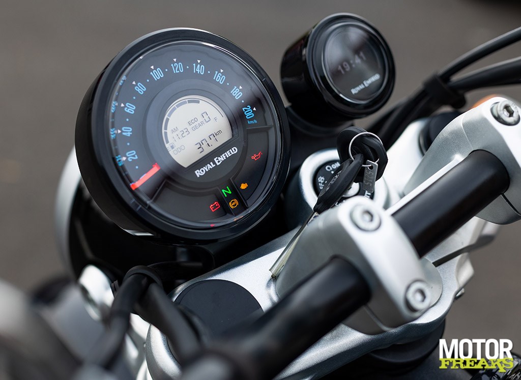Met een opgegeven zithoogte van 740 mm voor beide uitvoeringen zal bijna iedereen beide voeten vlak aan de grond kunnen zetten, de voetsteunen zitten ver naar voren en het brede touring-stijl stuur is van instelbare hendels voorzien, voor rem en koppeling, wat best opmerkelijk is voor een kabelkoppeling. Het display bestaat uit een enkele ronde klok met daarin een klein digitaal display met dubbele tripmeter, brandstofindicator, een klokje en een versnellingsindicator. De USB-aansluiting is onder het linkse zijpaneel aangebracht. Tot slot is de Super Meteor standaard met de Enfield Tripper navigatie uitgerust, ontwikkeld in samenwerking met Google en twee jaar geleden voor het eerst bij Meteor 350 toegepast.