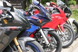Als een zwaar bulderende karavaan werden de verplichte (en o zo saaie) Autobahn kilometers afgelegd. Overbodig te vertellen dat de Aprilia en de Ducati, dankzij de verre van legale uitlaten, de boventoon voerden qua geluidsbeleving. De 999 was uitgevoerd met een fraaie Termignoni, de RSV1000 Factory was vlak voor onze test nog voorzien van - net zo - fraaie Akrapovic einddempers.