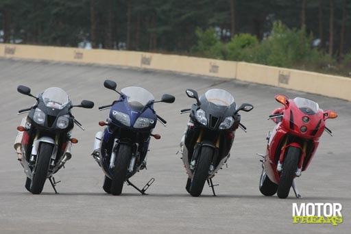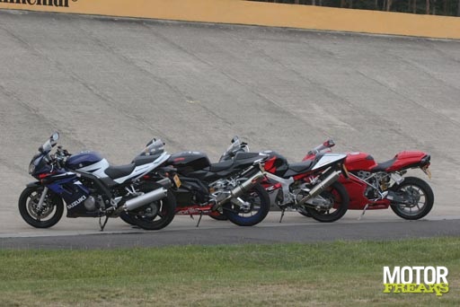 De RSV1000 Factory werd geïntroduceerd in Augustus 2003 en is nog tot op heden ongewijzigd, de VTR1000 SP-2 gaat zelfs nog een jaar verder terug. Van de Honda is inmiddels bekend dat het de laatste der Mohikanen is. De laatste SP-2"en gaan over de toonbank en op=op. De reden daarvoor is trouwens simpel: met het gelijkstellen van de cilinderinhoud in het WK Superbike werd de weg vrijgemaakt voor de Fireblade en was de SP-2 overbodig geworden. In feite staan hier dus vier motoren met vier verschillende "oorsprongsdata"; de Suzuki is dus nieuw, de Ducati één modeljaar oud, de Aprilia twee modeljaren oud en de Honda zelfs drie modeljaren oud. Iets wat trouwens aan geen van de motoren is af te lezen, want nog steeds staan hier vier motoren waarmee je anno 2005 absoluut gezien mag worden. De SV1000SZ is de langverwachte volkuip versie van de SV1000, een motor die al enkele jaren succesvol op de markt is en waarmee Suzuki een langgekoesterde wens van veel twinrijders heeft ingewilligd, die na het wegvallen van de TL-R in een vacuüm terecht waren gekomen. De 999 is het antwoord van Pierre Terblanche op het legendarische Tamburini-ontwerp en is onmiskenbaar een echte Ducati. De RSV1000R Factory had Aprilia"s laatste troef in het WK Superbike moeten zijn, maar werd jammer genoeg nooit ingezet en de VTR1000 SP-2 behoeft eigenlijk geen toelichting. Als debutant werd de motor in het jaar 2002 meteen wereldkampioen, net als zijn voorganger (de SP-1) dat in 2000 werd. 2002 was trouwens het eerste en meteen laatste seizoen dat de motor zou deelnemen aan het WK Superbike, aangezien een jaar later alle Japanse fabrieken, uit onvrede met de reglementen, zich terugtrokken uit het gewraakte kampioenschap.