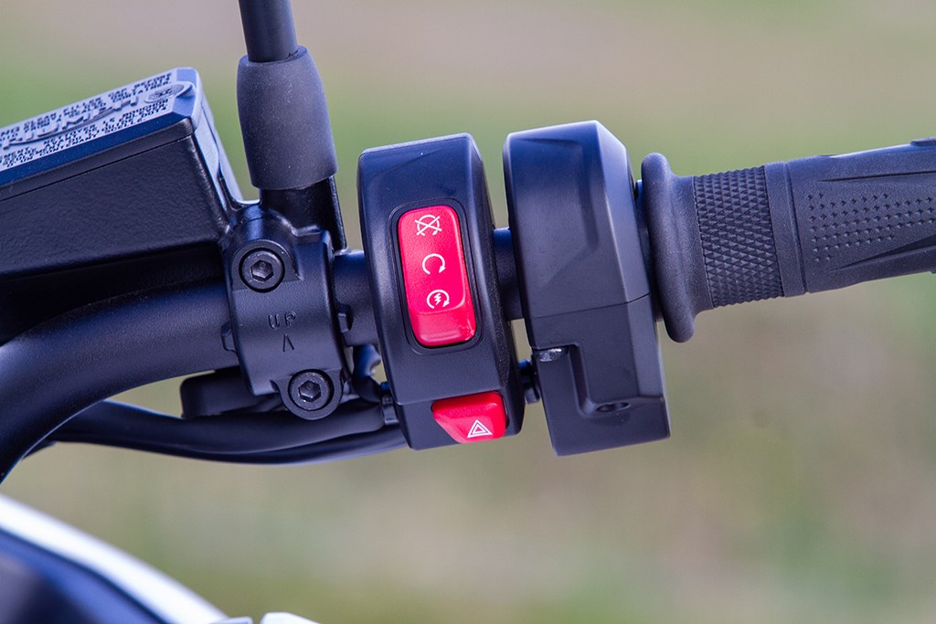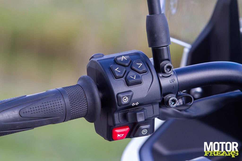 Veel elektronica, dus veel schakelaars aan het stuur. De schakelaar voor de cruise controle zit links aan de achterkant (net buiten beeld). Vervelend is wel dat resetten van de tripmeter diep in het systeem-menu moet worden gedaan (en dus niet tijdens het rijden met een druk op een knop)