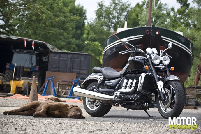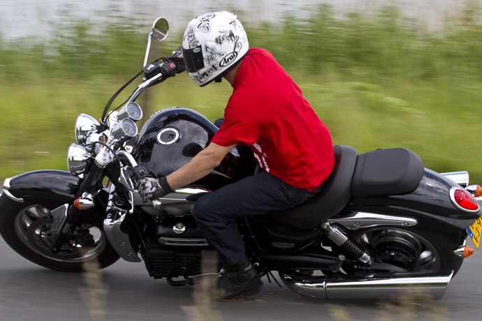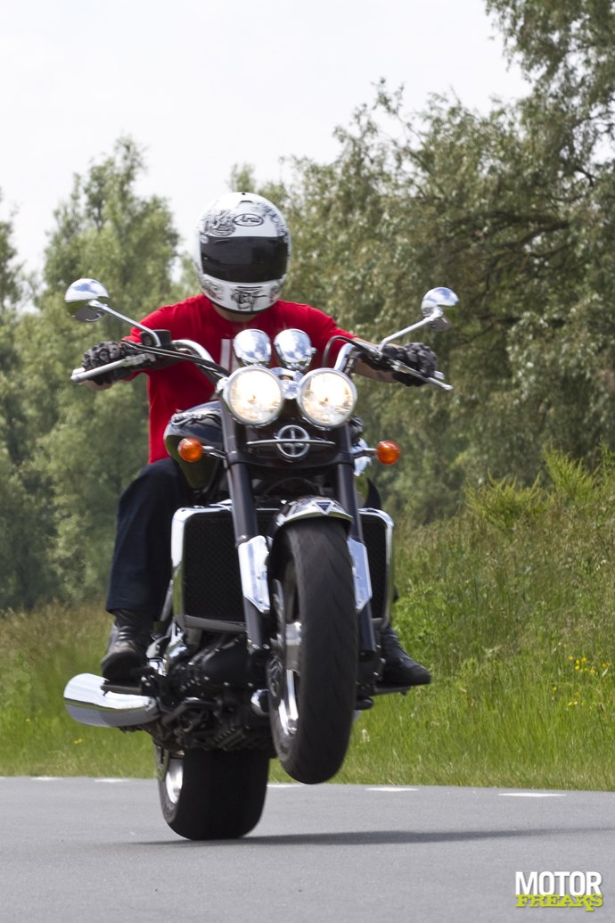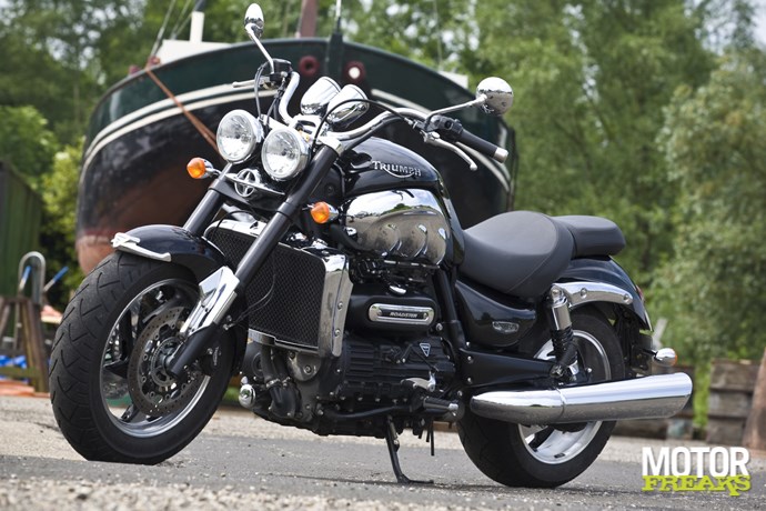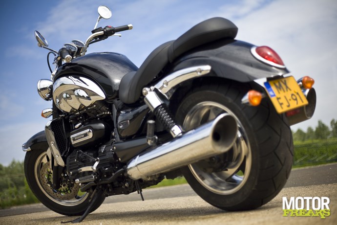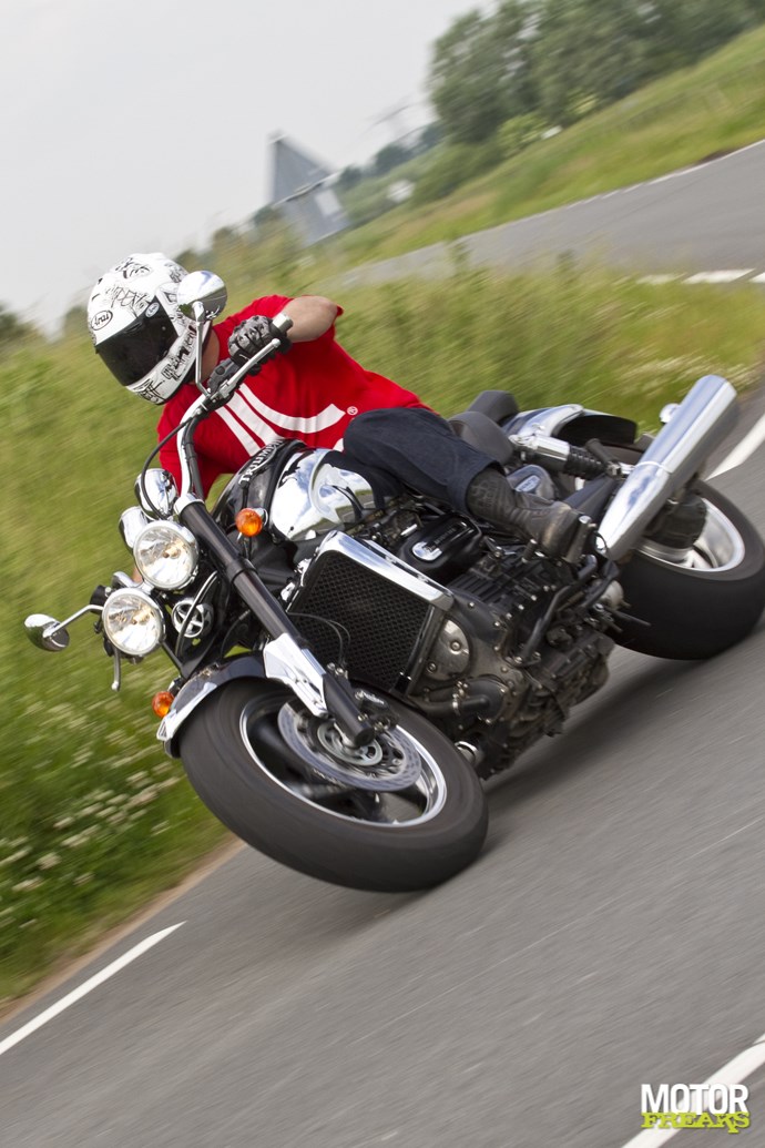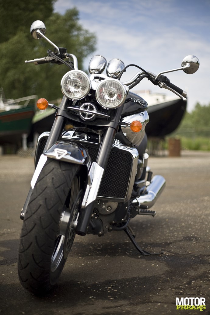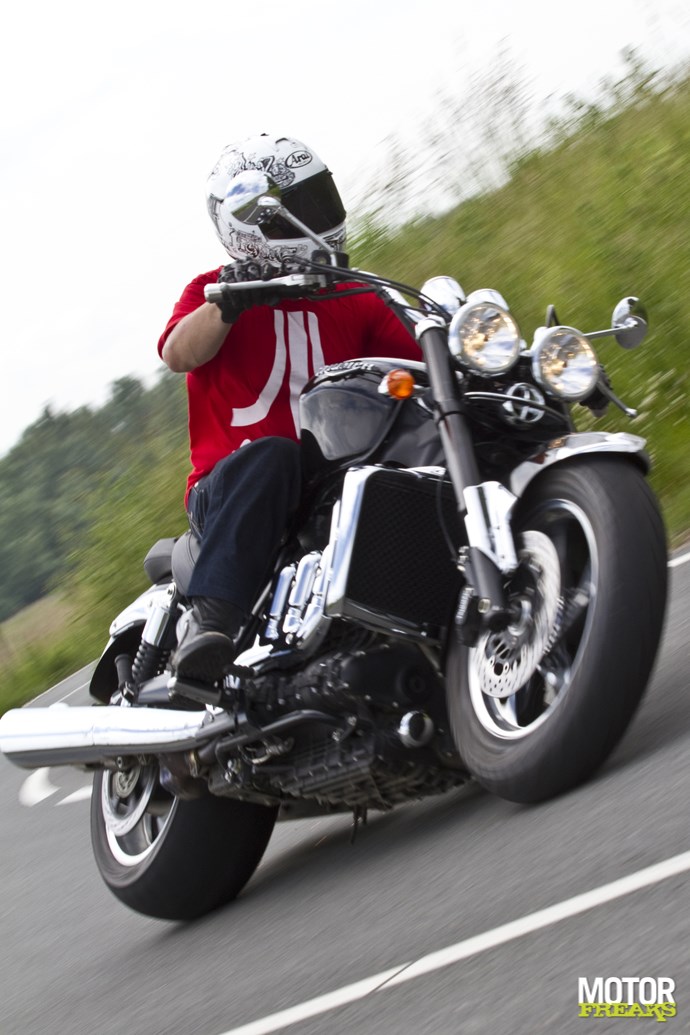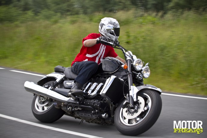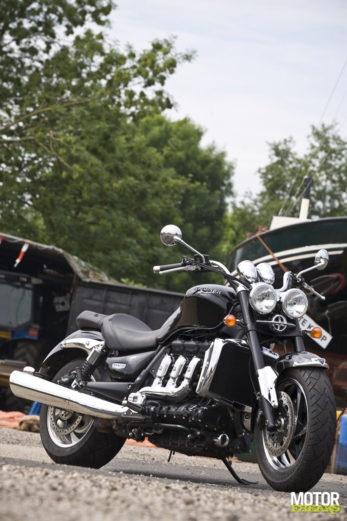 Regenrijden is dan ook niet bepaald het sterkste punt van de Rocket. Als het zelfs op schoon, droog en warm gezond asfalt al wenig moeite kost om het achterwiel te laten spinnen (nou vooruit, met een heel heel klein beetje voorbedachten rade) behoeft het geen uitleg dat alle 240 millimeters ten spijt, het op andere ondergrond nog een stuk eenvoudiger wordt. Alsof je dat iets kan schelen; schop het ding in een hoge versnelling en laat het koppel het werk doen. Geeft je zelf de kans om uitgebreid te genieten van het geluid. Met weinig andere krachtbronnen te vergelijken maakt het driecilinderblok een haast onaards diepe brom waarvan je zónder kijken al weet dat deze veroorzaakt wordt door eerlijke kubieke centimeters. ‘There’s no substiute for cubic inches’ als je de bewoners van het continent aan de andere kant van de plas moet geloven en warempel… op dit vlak hebben ze gelijk. Wát een sound. Wel een sterk punt, keer op keer weer, is accelereren. In elke versnelling weer; gas erop en laat je voorstuwen op een tsunami aan koppels. De vermogensafgifte is uiteraard sterk gericht op newtonmeters, maar ook de stal is redelijk goed gevuld. Smetteloos strak doorloopt de motor de toerenschaal, die voor het gemak een iets andere indeling heeft dan we van de supersportjes en superbikes gewend zijn. alles speelt zich ruwweg tienduizend toeren eerder af, dus wordt er een hoop geld bespaard op het weglaten van de ééntjes voor alle cijfers. Mooi meegenomen. De grafiek is al even strak als de twee en een halve meter rechtuitstabiliteit en je zou zwéren dat je het verschil voelt tussen de voortstuwing op koppel in lage toeren en de push van het vermogen in de hogere regionen. Lachen joh.
