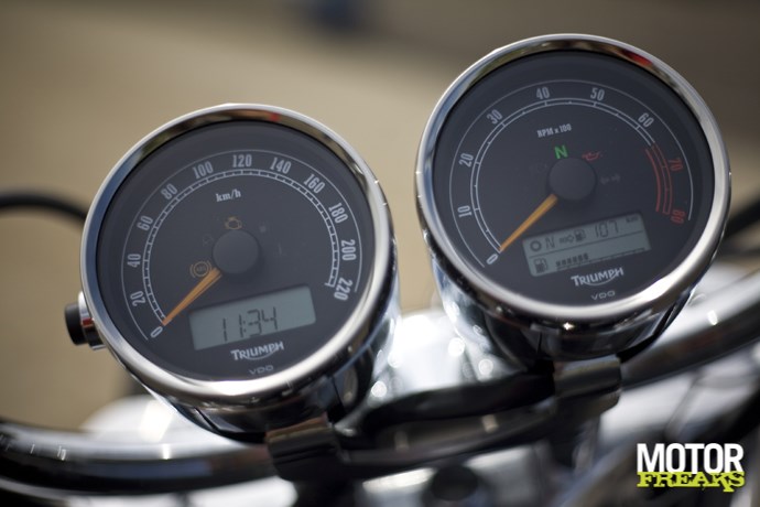 Met een ‘niet kijken, gewoon zitten’ kom je vanzelf tot een zithouding die nog het meest neutraal is. Want behalve de airbox aan de linkerkant van de tank heb je rechts weer te maken met de achterrem-installatie… niet kijken, gewoon gaan zitten werkt nog het beste. Je kunt je beter op andere zaken concentreren. Het mag als vanzelfsprekend gelden dat de Roadster niet het ideale apparaat is om eens echt flitsend tussen de fietsers over een dijk mee te jagen. Zaken als geometrie en massa spelen er een rol in dat de Triumph meer aanhanger is van de vloeiende lijnen. Daar staat tegenover dat als je eenmaal een lijn aansnijdt, alles kleiner dan een vuurwerkramp de motor niet van de gekozen lijn af krijgt. Fluks vloeiend meanderen we zo rustig de zonsondergang tegemoet, ondertussen verwonderd starend naar de eigen reflectie in het veelal aanwezige chroom en glaasjes van de tellers. Hectiek is een verzonnen term. Werken echter niet; de motor is ook rechtuit rijdend bijzonder stabiel en het kost dan ook enige moeite ‘m een bocht te laten nemen. Hoe groter de hellingshoek, hoe meer moeite het relatief kost. Aan de andere kant is de grondspeling on-Amerikaans dik in orde. Voordat je ook maar een onderdeel aan de grond zet ben je al leuk bezig, zeg maar. Enfin, de foto’s bieden wat dat betreft voldoende tekst en uitleg.