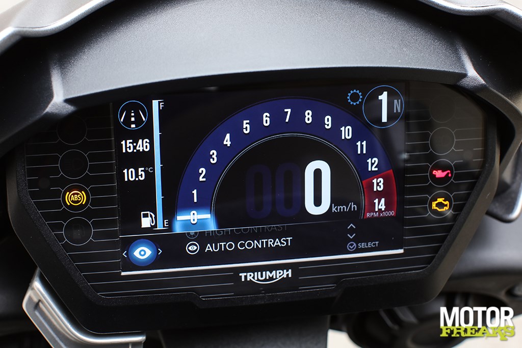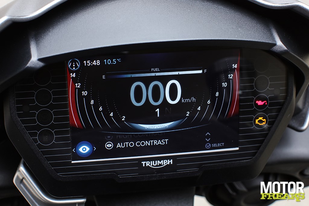 Hoewel het TFT scherm overzichtelijk is en maar liefst 6 verschillende stijlen heeft waaruit kan worden gekozen, is het minder overzichtelijk dan de TFT schermen zoals door Ducati en Yamaha toegepast, maar dat is natuurlijk ook een kwestie van smaak. Vooral de icoontjes voor rijmodi zijn verwarrend, het ziet er weliswaar fraai uit maar een simpel ‘Rain, Road, Sport, Track en Rider’ was in onze ogen veel overzichtelijker geweest. Het zadel is met een zithoogte van 825mm een tikkie hoger dan de oude Street Triple R, waardoor je meer op dan in de motor zit. De voetsteunen zijn sportief hoog geplaatst, maar zonder dat het oncomfortabel is en het fraaie brede stuur ligt lekker in de hand. Volgens Triumph is nieuwe de Street