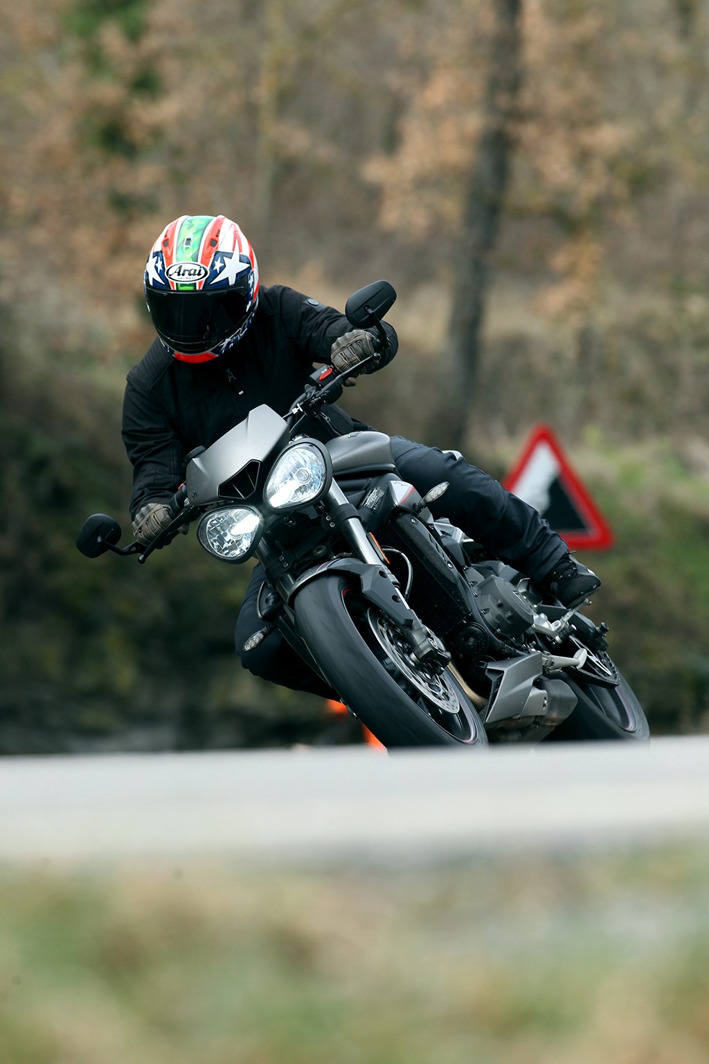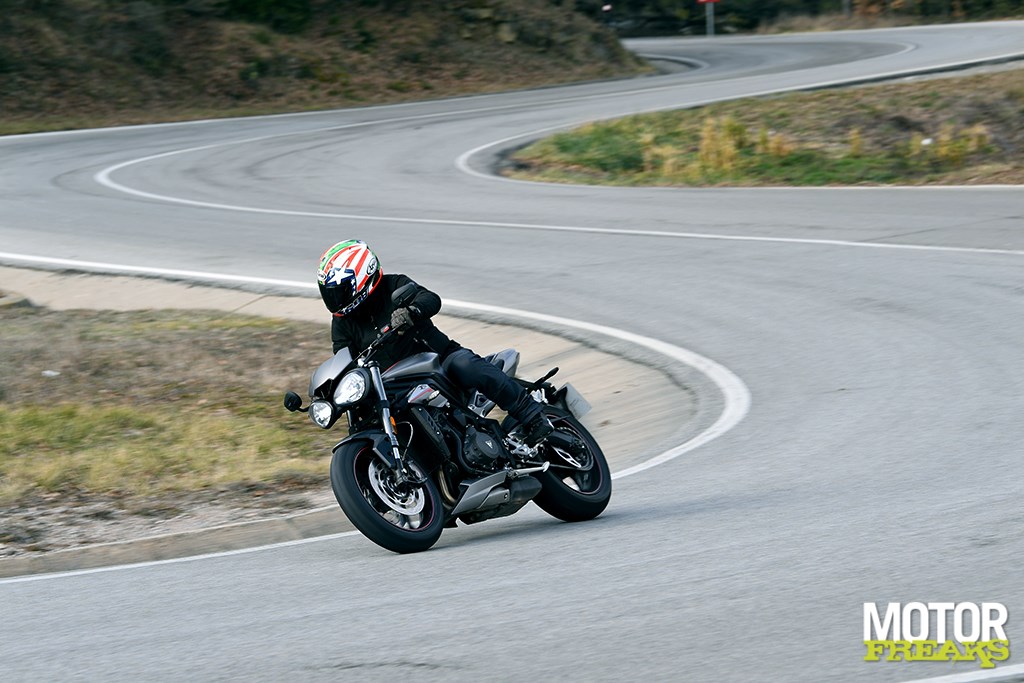 Het geclaimde lichtvoetige sturen kwam niet uit de verf, maar dat bleek een combinatie van Supercorsa, koud en nat asfalt en lage bandenspanning te zijn. Wat dat aangaat is het jammer dat Triumph met de bandenkeuze voor imago is gegaan: minder sportieve banden als de Bridgestone S21, Metzeler Roadtec 01 en Dunlop Road Smart III zijn voor op straat een vele betere keuze vanwege het lichtvoetige stuurkarakter en de grip bij koud en nat, en weten bovendien op een circuit ook nog een goed hun mannetje te staan.