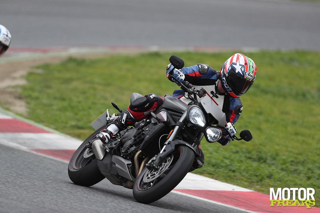 Het is dat ik twee dagen eerder in Nederland nog kon schaatsen, anders had ik dit best fris gevondendagelijkse portie fun naar het werk gebruikt. De S heeft een opgegeven vermogen van 113 pk bij 11.250 toeren per minuut en een koppel van 73 Nm bij 9.100 toeren per minuut. De oude zakjapanner leert ons dat dát al 6,6% meer vermogen en 7,3% meer koppel is, en dan is dit nog maar het begin. De R is volgens Triumph de perfecte mix van power en performance, voor de sportieve motorrijder op straat en levert een topvermogen van 118 pk bij 12.000 toeren en een maximum koppel van 77 Nm bij 9.400 toeren per minuut, terwijl bij de RS alle registers zijn opengetrokken op elektronisch gebied. “Een wapen voor de straat én het circuit,” aldus Miles Perkins, Head of Brand Management. De cijfers? Een topvermogen van 123 pk bij 11.700 toeren en 77 Nm koppel bij 10.800 toeren per minuut. Kijk, dat begint ergens op te lijken.