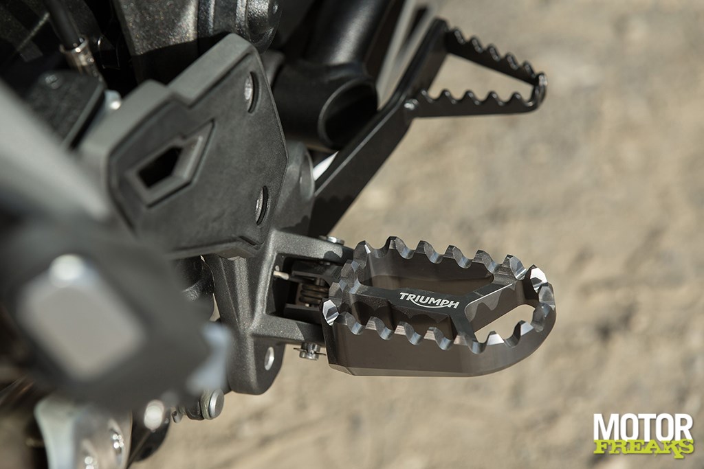 Van de twee rijmodi die Triumph voor offroad gebruik heeft bedacht (Offroad en Offroad Pro) start ik de route in Offroad, waarbij de demping van de vering op offroad gebruik is aangepast, de ABS op het achterwiel is uitgeschakeld en de tractiecontrole een bepaalde mate van wielspin toelaat. Hoeveel wielspin kan Triumph’s technische goeroe Stuart Wood ons echter niet zeggen, hij houdt het op een significante hoeveelheid wielspin. In Offroad Pro zijn normaal gesproken ABS en tractiecontrole uitgeschakeld, maar voor deze test heeft Triumph de setting aangepast en is er nog een kleine mate van ABS op het voorwiel. Elke rijmodus kan namelijk nog geheel naar eigen inzicht worden aangepast, wat de ‘Personal’ rijmodus in feite overbodig maakt, maar dat even terzijde.