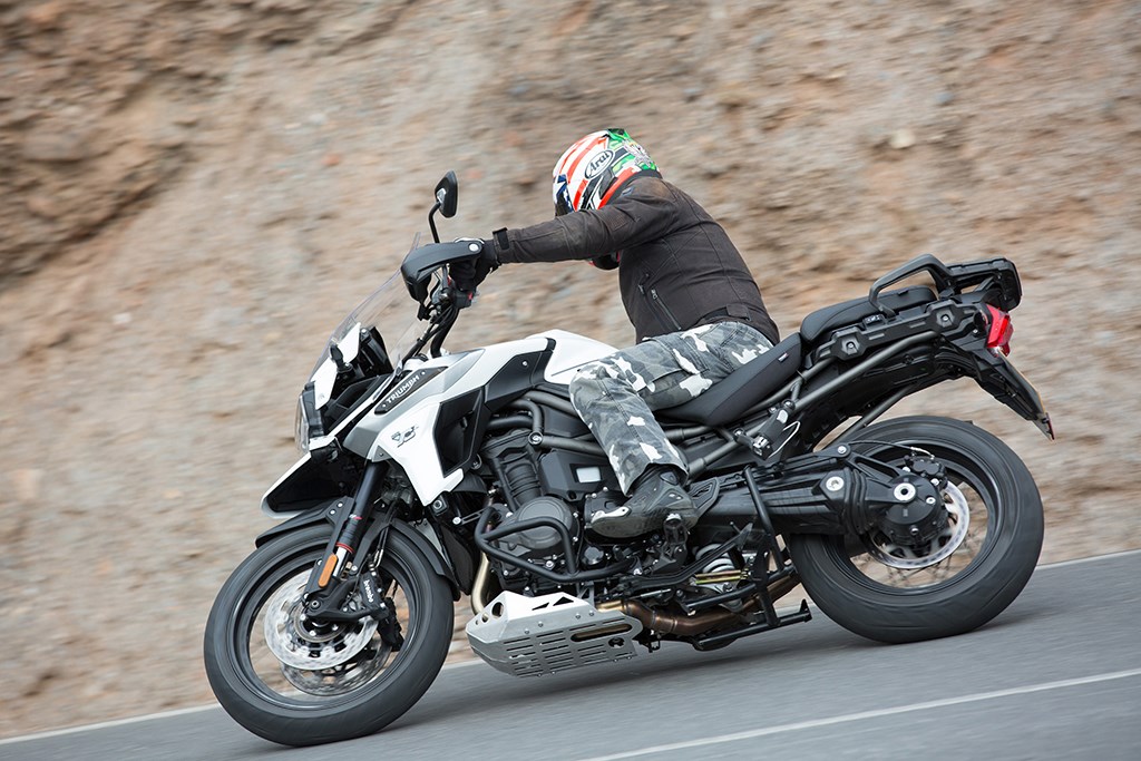 Vanaf stationair toerental pakt de driecilinder mooi op en bouwt z’n vermogen mooi lineair op, waarbij het blok rond de 3.500 toeren voelbaar sterker wordt en daarna in een ruk doorloopt tot ergens in het vijfcijferige gebied de toerenbegrenzer een eind aan de pret maakt. Op de bochtige wegen door het prachtige geelgekleurde berglandschap van Almeria blijft de nieuwe quickshifter met autoblipper voor het terugschakelen dan ook grotendeels onaangeraakt. Zelfs krappe haarspeldbochten in derde versnelling slikt de Tiger 1200 als zoete koek, de enige reden om dat echter niet te doen is omdat je met terugschakelen naar 1 motorrem hebt. Oneffenheden worden door de vering serieus goed geabsorbeerd, de semi-actieve vering uit huize WP is een serieuze verbetering ten opzichte van z’n voorganger. Het is echter niet alleen de vering waarmee Triumph een flinke stap vooruit heeft gezet, zeker op tempo is het opvallend hoeveel gemakkelijker de Tiger van richting te veranderen is. En dan zijn er nog de Brembo Monobloc M4.32 radiale remklauwen, die dankzij remblokken met verbeterde voering niet alleen meer remkracht weten te realiseren, maar ook nog eens een heerlijk sportieve bite hebben, waardoor in combinatie met het Continental bochten-ABS de Tiger heerlijk sportief de bocht in kan worden geremd. Enkel wanneer voor hairpins het anker het laatste moment wordt uitgegooid heeft de achterkant de neiging om te gaan kwispelen, maar echt verontrustend wordt het nooit. Buiten dat echter niets dan lof over de Brembo remmelarij.