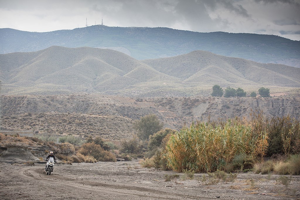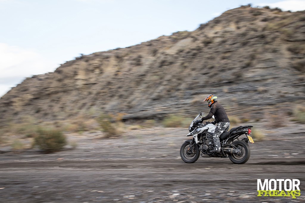Als extra bonus bovenop de test heeft Triumph de tweede dag een heus offroad parkoers voor ons uitgezet, waarbij de groep in drieën wordt gesplitst: beginners, gemiddeld en gevorderden, zodat iedereen op z’n eigen niveau aan den lijve kan ervaren wat de Triumph Tiger 1200 XC zo allemaal offroad kan. Vanaf het circuit van Almeria is een prachtige route uitgezet die varieert van rotsachtige ondergrond tot zwart zand dat veel losser en muller is dan het oog doet vermoeden. De standaard Metzeler Tourance