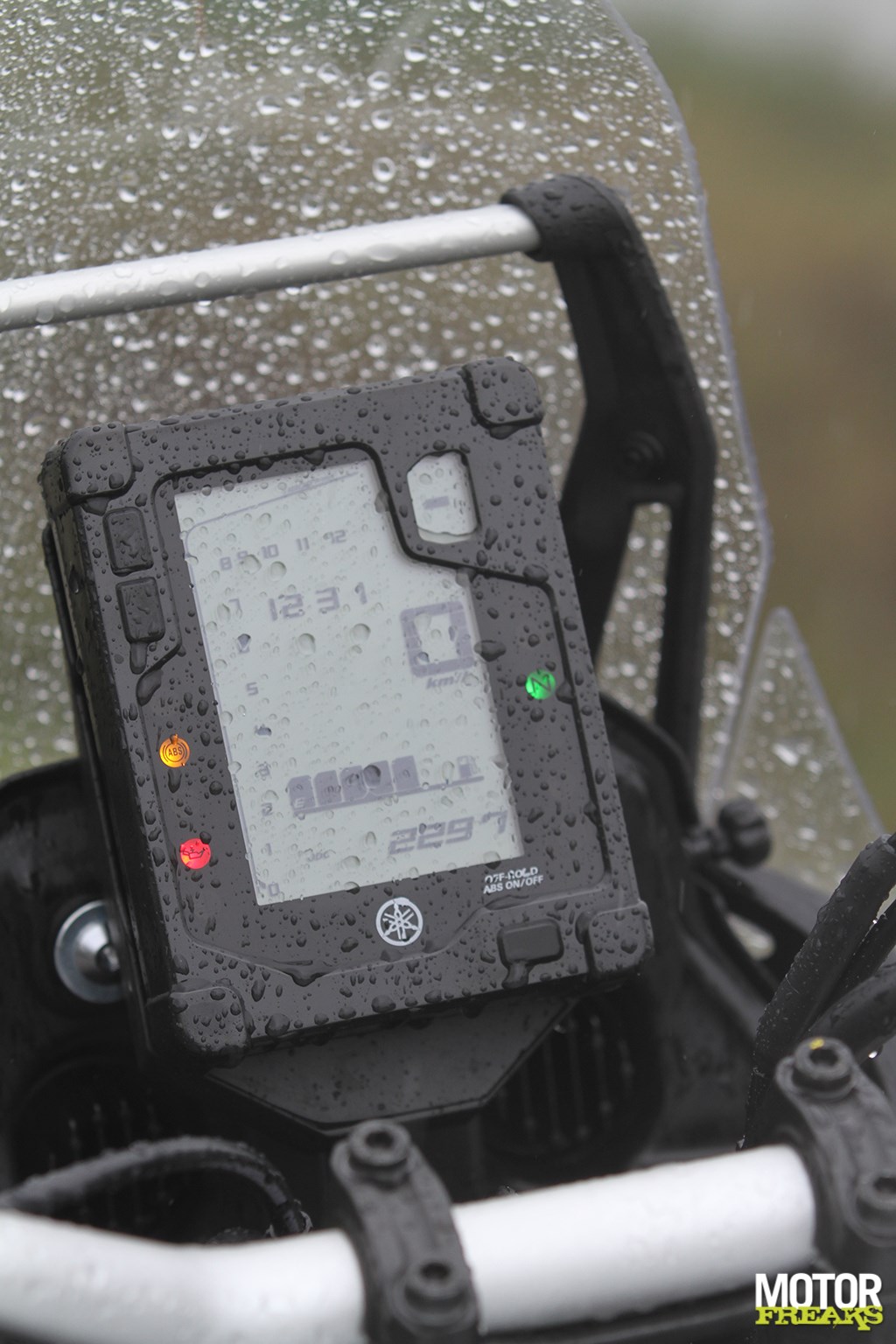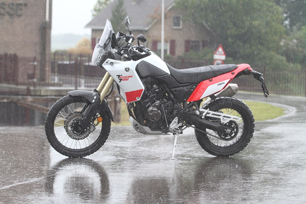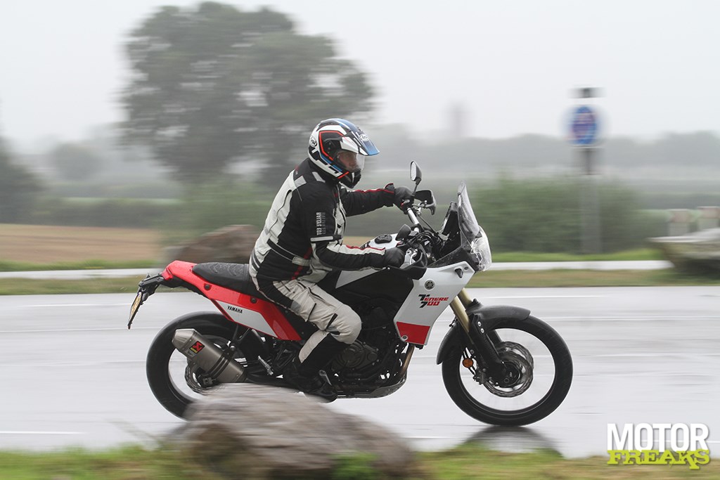 Als 'ie nou nog lang door blijft gaan, dan peer ik 'm er zo tussenuit. De waterdichtheid van m'n kleding wel lang genoeg getest...maar ook daarmee klinkt deze allroad heel beschaafd. Zelfs als je vol gas bij het stoplicht wegstuift. Want dat is het leuke aan deze Ténéré: als je hem laag op de toeren rijdt, is het een gemakkelijke, rustige allemansvriend. Maar krijg je het op je heupen, dan trek je hem door in de toeren en dan is het een razendsnelle, sportieve allemansvriend. De gasaanname blijft perfect, de bak schakelt soepel en precies en de afstanden tussen de versnellingen zijn goed gekozen. Dat merk je vooral in de file, waar je nooit loopt te zoeken tussen twee versnellingen. Hij trekt altijd wel en gaat er zelfs bij 120 in de zes nog vlot vandoor, met 5300 tpm op de klok. Zelfs bij 180 km/uur, als de oude 660 al lang en breed de handdoek in de ring had gegooid, trekt de 700 nog door. En dat terwijl de Ténéré nog behoorlijk zuinig is ook: ik reed twee tanks met 23 km per liter. Volgens Yamaha kom je dan ook 350 km ver, maar ik tankte toch met 254 km op de teller, als het een-na-laatste blokje van de benzinemeter al even uit was. Met dus nog 4,5 liter in de