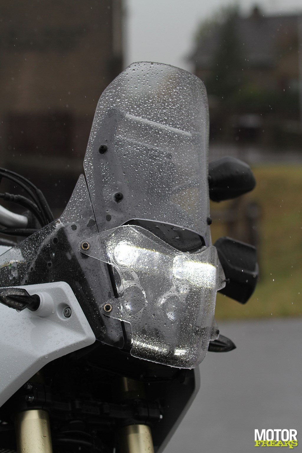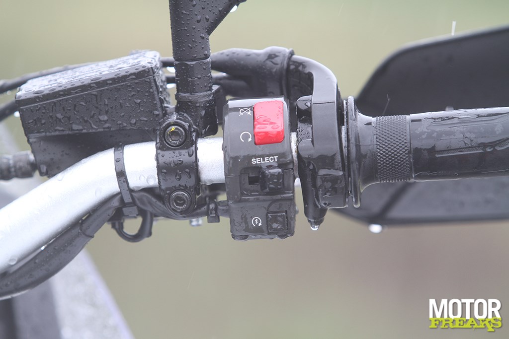 Zo zou 't altijd moeten zijn. Die verkeersluwte dan hèhooggeplaatste uitlaat, waar het water niet zomaar inloopt bij een doorwading. Hij staat op een 21 inch voorwiel en een 18 inch achterwiel, dat gemakkelijk over hobbels loopt. Hij heeft spaakvelgen – sterker en flexibeler dan gietwielen – en een klein ruitje dat genoeg bescherming biedt voor een snelwegrit. De gemakkelijk te bedienen zijstandaard heeft een grote voet voor zachte ondergrond. Aan alles is gedacht