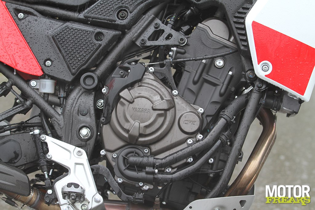 De Ténéré is een motor waarmee je overal kunt en durft te rijden, omdat jij de baas bent en de motor niet met je aan de haal gaat. Dat wil niet zeggen dat de motor tam aanvoelt, in tegendeel. Voor de aandrijving heeft de Ténéré 700 de 689cc CP2 aandrijfunit van de MT-07 en de Tracer 700 onder de framebuizen. Voor deze toepassing is het blok wel onder handen genomen. Zo is de injectiemapping aangepast, evenals het koelsysteem, de uitlaattuning, de airbox en de eindoverbrenging (nu 46/15).