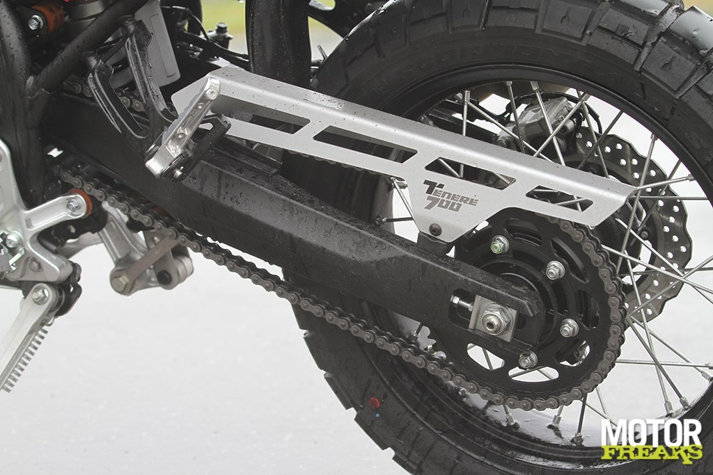 De Ténéré 700 is het resultaat van een lang ontwikkelingsproces. Het CP2-motorblok mag dan van de Tracer 700 komen, dat wil niet zeggen dat het een opgeleukte Tracer is: de Ténéré is echt een speciaal ontwikkelde motorfiets, gericht op echt dual-purpose-gebruik. Dat begint al met het geheel nieuw ontwikkelde stalen vakwerkframe, dat middels demontabele onderbuizen ook de titel “dubbel wiegframe” zou mogen dragen. Opvallend is dat de onderste buizen via de schetsplaten van de voetsteunen aan het hoofdframe aansluiten. Je ziet ook dat er motorophangpunten aan het blok ongebruikt zijn en dat de schokdemper veel rechterop staat. Uiteraard staat het geheel hoog op de poten, voor heeft de Ténéré een 43 mm KYB USD met 210 mm veerweg en instelmogelijkheden voor de in- en uitgaande demping. Via ontluchtingsschroeven in de top kan eventueel opgebouwde druk worden afgelaten, zoals op echte offroads. De volledig instelbare KYB monoschokdemper biedt een veerweg van 200 mm en is voorzien van een handversteller voor de veervoorspanning. Alles is gericht op praktisch nut en echt offroad-gebruik. Zo heeft de Ténéré een aluminium carterbeschermplaat en een